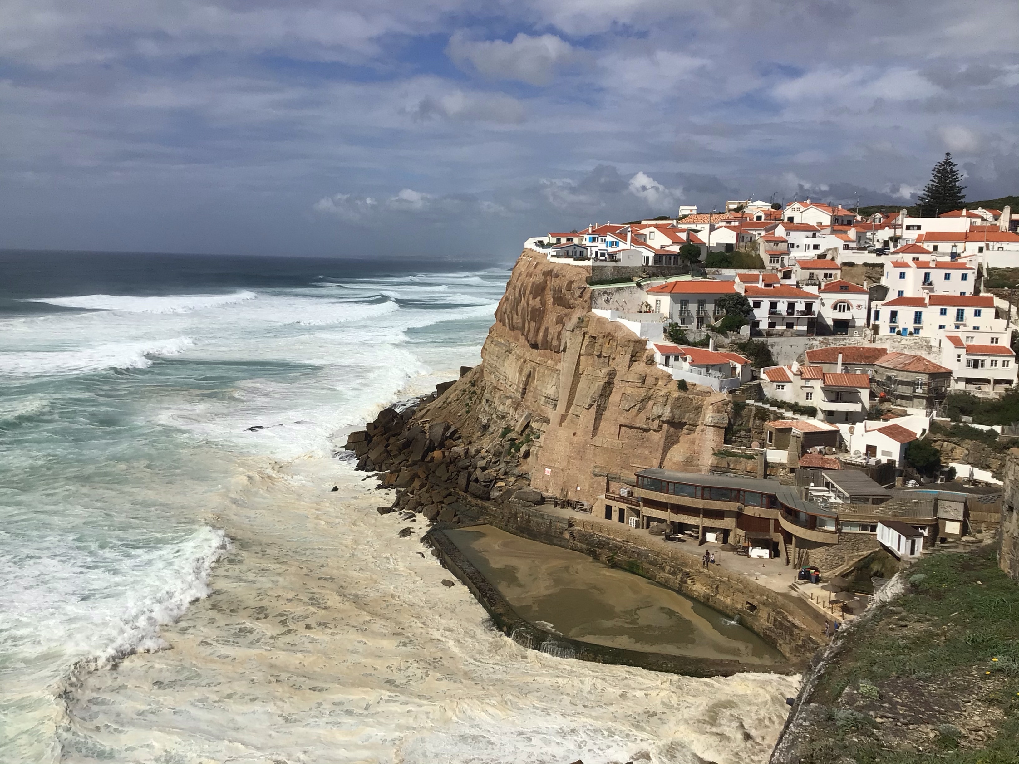 A un moment, je bifurque à droite pour arriver à Fontanelas où je m’arrête faire mes course du samedi. Le frigo et les placards sont vides. Je trouve un commerce dans lequel sont vendus énormément de produits français (au prix fort). Je trouve même du Tipiak mais pas en sachet précuit. Dommage. J’achète aussi de quoi faire ma pause 4h et descends sur Azenhas do Mar, petit village accroché à la falaise. Je croise deux anglaises assez mûres qui me disent : « It’s wonderful. We’re too lucky ! ». J’aquiesce. Je m’installe ensuite pour boire mon Icetea et manger ma banane en admirant cet endroit.