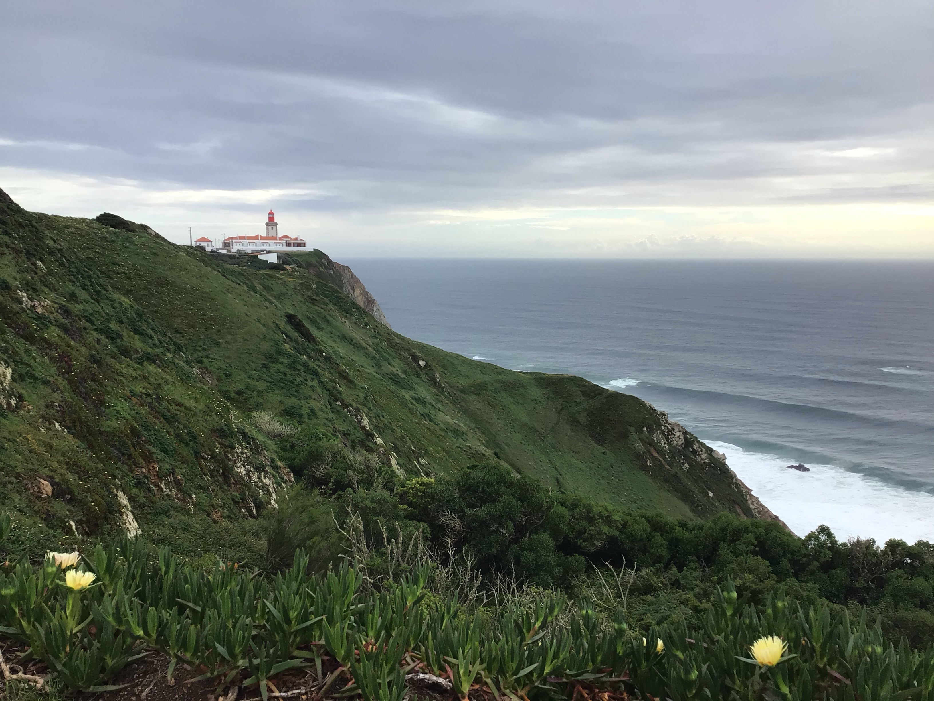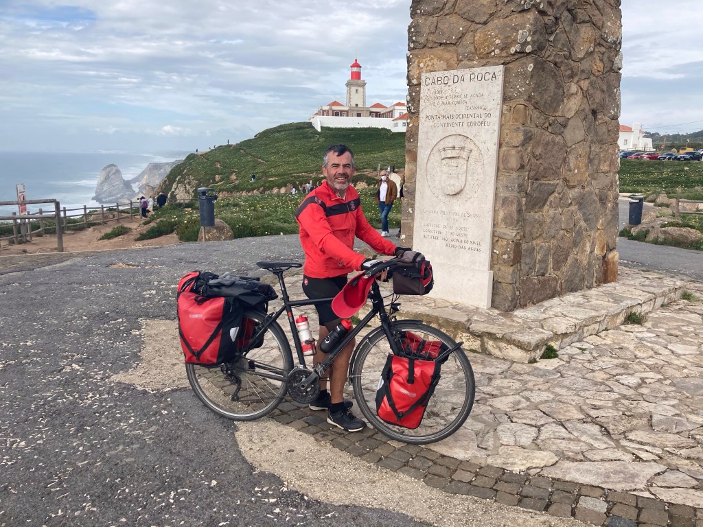 Il me faut repartir. Et toujours pas de pluie. J’entre dans le Parc Naturel de Sintra-Cascais et me dirige vers Sintra par cette même route chérie. Mais là, ça se rétrécit et ça grimpe drôlement. D’ailleurs je croise des cyclistes qui doivent venir s’amuser dans le coin. En vue du monastère, ça se calme. Grand faux plat puis descente vers la mer en direction de la pointe la plus à l’ouest de l’Europe : Cabo da Roca. Il y a du monde. J’en profite pour me faire tirer le portrait du bout du continent.