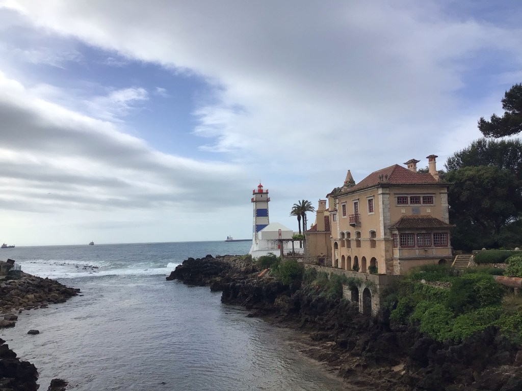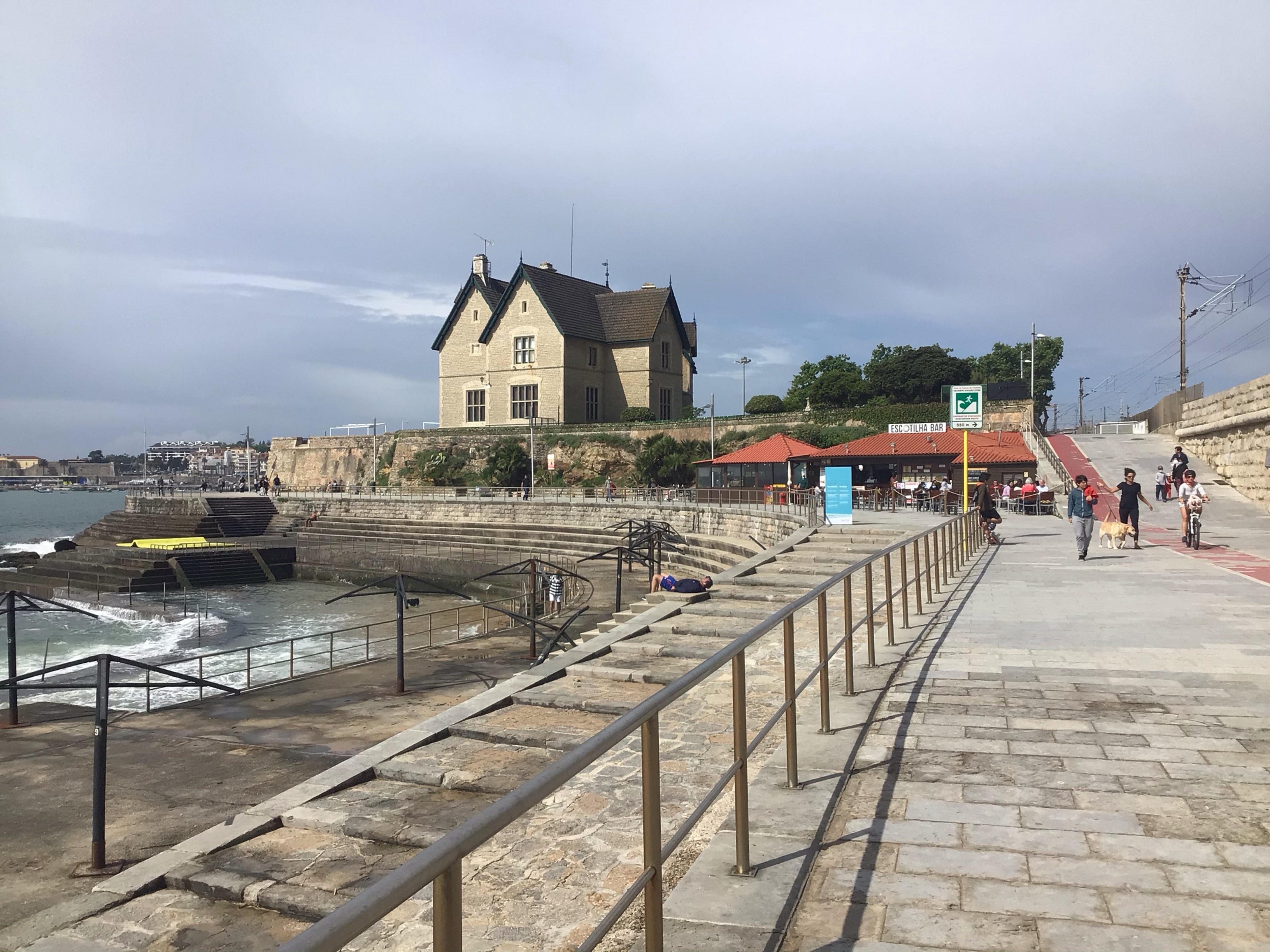 Je croise donc des cyclistes en mode solo pépère, solo à bloc, triathlète tête dans le prolongateur, club de compétiteurs se tirant la bourre, club de retraités taillant la bavette (salut les copains du Stade !), duo de femmes, duo d’hommes. De tout. Idem pour les runners … Il faut dire que le cadre est grandiose pour faire son sport dominical. Je finis par arriver à cette grande et belle station balnéaire de Cascais où je m’arrête prendre mon café dans un bar chic en front de mer. Que de monde en ce dimanche matin …