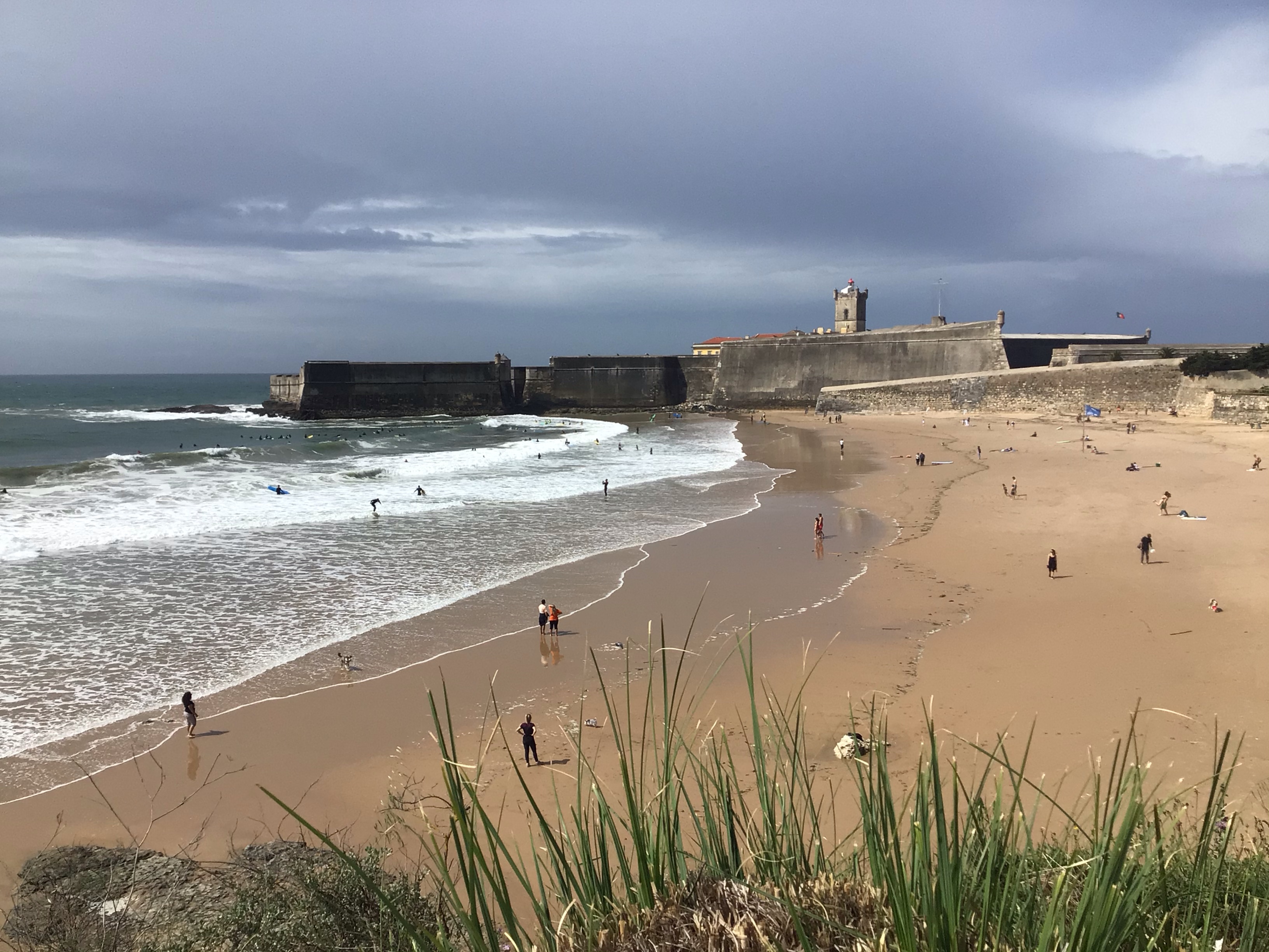 Je retrouve ma piste cyclable rouge que je vais parcourir … jusqu’à Lisbonne pratiquement sans discontinuité. Sinon il m’aurait fallu emprunter la N-247 puis la N-6 qui sont passées en 2 * 2 voies. Beaucoup moins sympa. Je longe donc la mer en rythme de croisière et profite de tout ce monde qui se balade, courre, pédale, surfe … Le temps passe vite. Cependant, certains runners prennent la piste cyclable pour une piste d’athlétisme. Heureusement qu’ils ne sont pas aux Pays-Bas !Il faut quand même rester sur ses gardes.