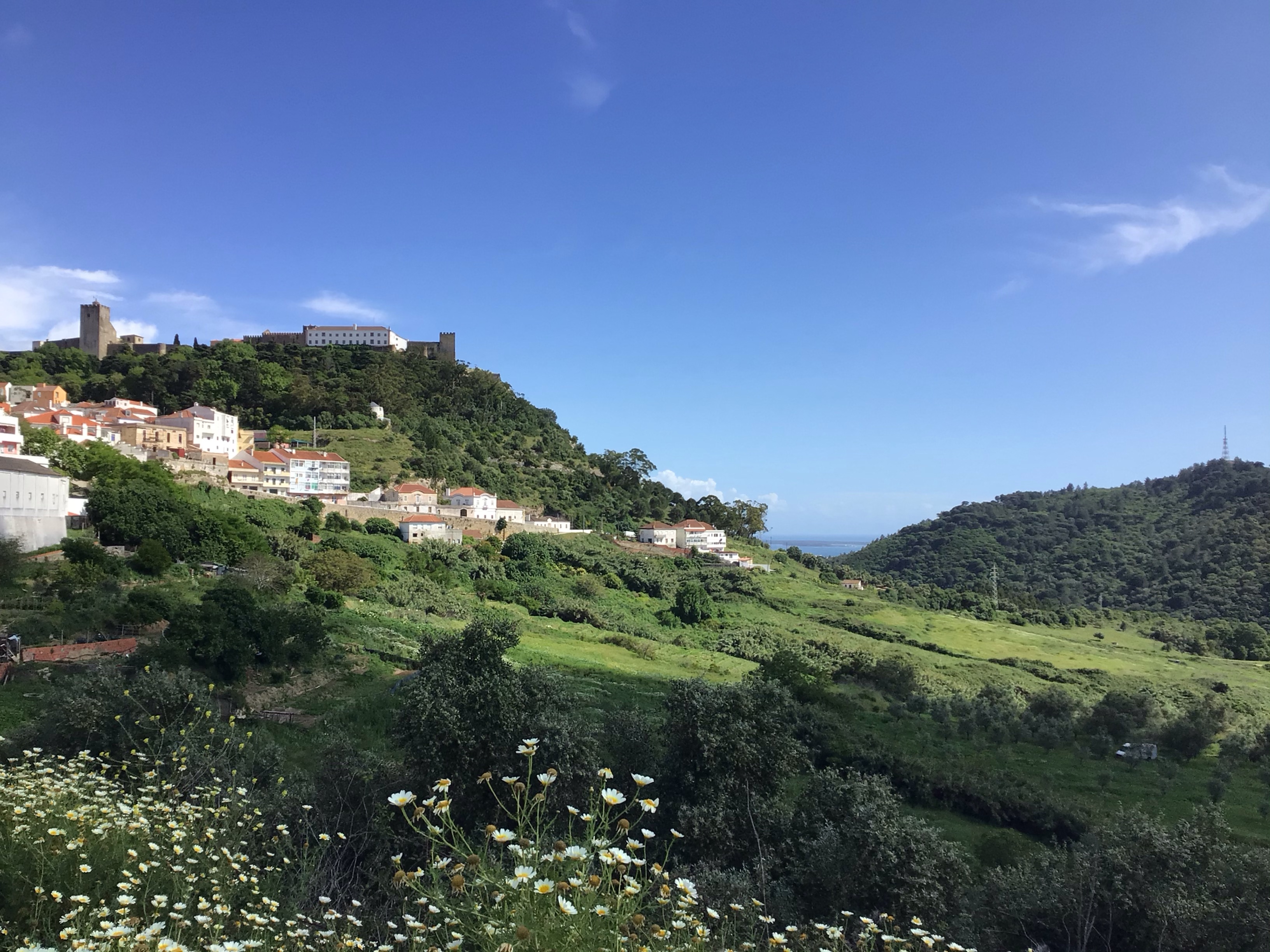 Une éclaircie quand même dans cette journée alors que je roule sur une petite route. Une Merco me double, klaxonne et se gare un peu plus loin. Le gars sort de sa voiture, me fait signe de m’arrêter et me dit avec l’accent : « Mais tu es de Toulouse ? C’est pas possible ! ». Et on se met à discuter sur le bord de la route. Il m’explique qu’il a vécu de 5 à 52 ans à Cugnaux. Il avait monté sa boite de transport et sponsorisait le club de cyclo de Cugnaux. Puis a travaillé pour Tisséo (la régie de transport en commun de l’agglo) et pour Verdier (bus scolaire notamment) avant de revenir au pays passer sa retraite. Il me propose de m’héberger à Motijo où il a un pied à terre qu’il aménage. Bizarrement, pendant qu’on discute, une averse tombe de nulle part ! Il est encore tôt et ce n’est pas ma direction. Et puis ce signe du ciel peut-être … Je ne sais pas mais je décline son invitation et continue ma route. J’arrive à Palmela où un château domine la vallée et la baie.