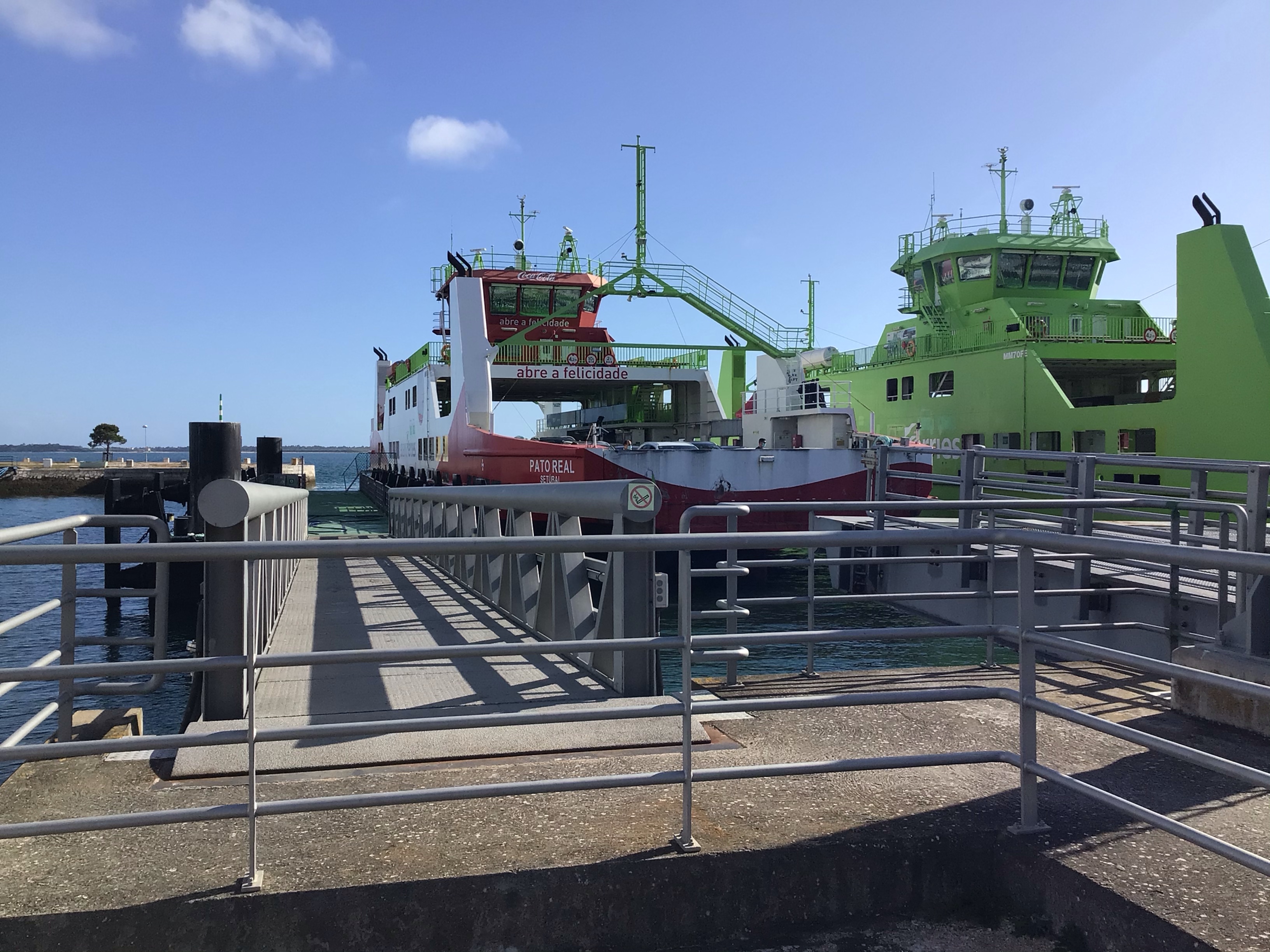 De ce côté, des vignes ont fait leur apparition et le paysage y est plus bucolique. Par contre, mon GPS me fait passer par un sentier destiné aux pompiers en cas d’incendie en contrebas du château. C’est abrupt, raviné et caillouteux. Je manque me casser la binette. Manquerait plus que cela. Je finis par arriver à Setubal, agréable ville à l’entrée de la baie et du rio Sado. Je me dirige à nouveau vers la gare maritime pour une nouvelle traversée en ferry vers Soltroia. Il est 17h00. Le ferry est à 17h30. Juste le temps de goûter et le ferry est déjà là.