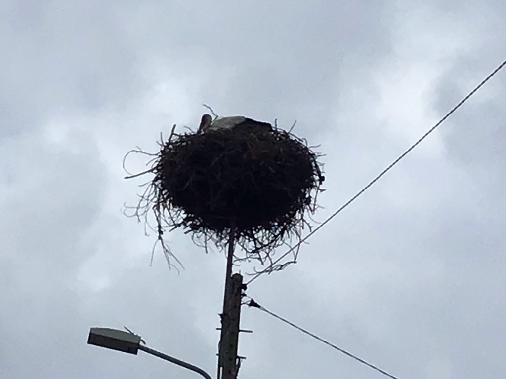 Un bébé cigogne tout gris est à l’intérieur et attend probablement la becquée. Au bout d’un moment, le couple réapparaît. La maman le nourrit et le papa semble surveiller les abords du nid. Il y a d’autres nids perchés sur les poteaux électriques. Je dois y aller. Je laisse les cigognes à leurs occupations et je reprends ma route.