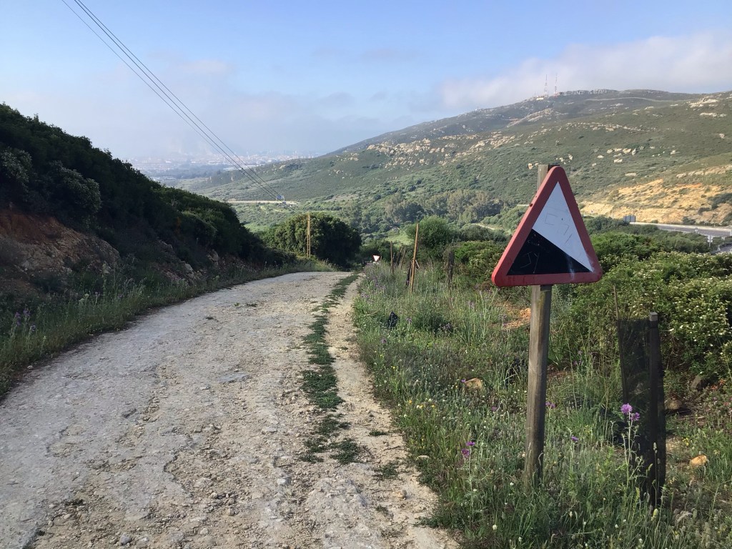 Comme prévu, ça se corse dès que je quitte le front de mer. Le réveil musculaire est pour le moins brutal. Je me retrouve sur une piste qui longe l’autoroute. A un moment, je suis obligé de poser le pied à terre devant un mur dont le revêtement est pourri. Mes pneus routes n’adhèrent pas. Je patine et risque de me casser la gueule. Un orteil pété, ça suffit ! Je laisse au loin et avec grand plaisir cette baie industrio-urbaine de Gibraltar.