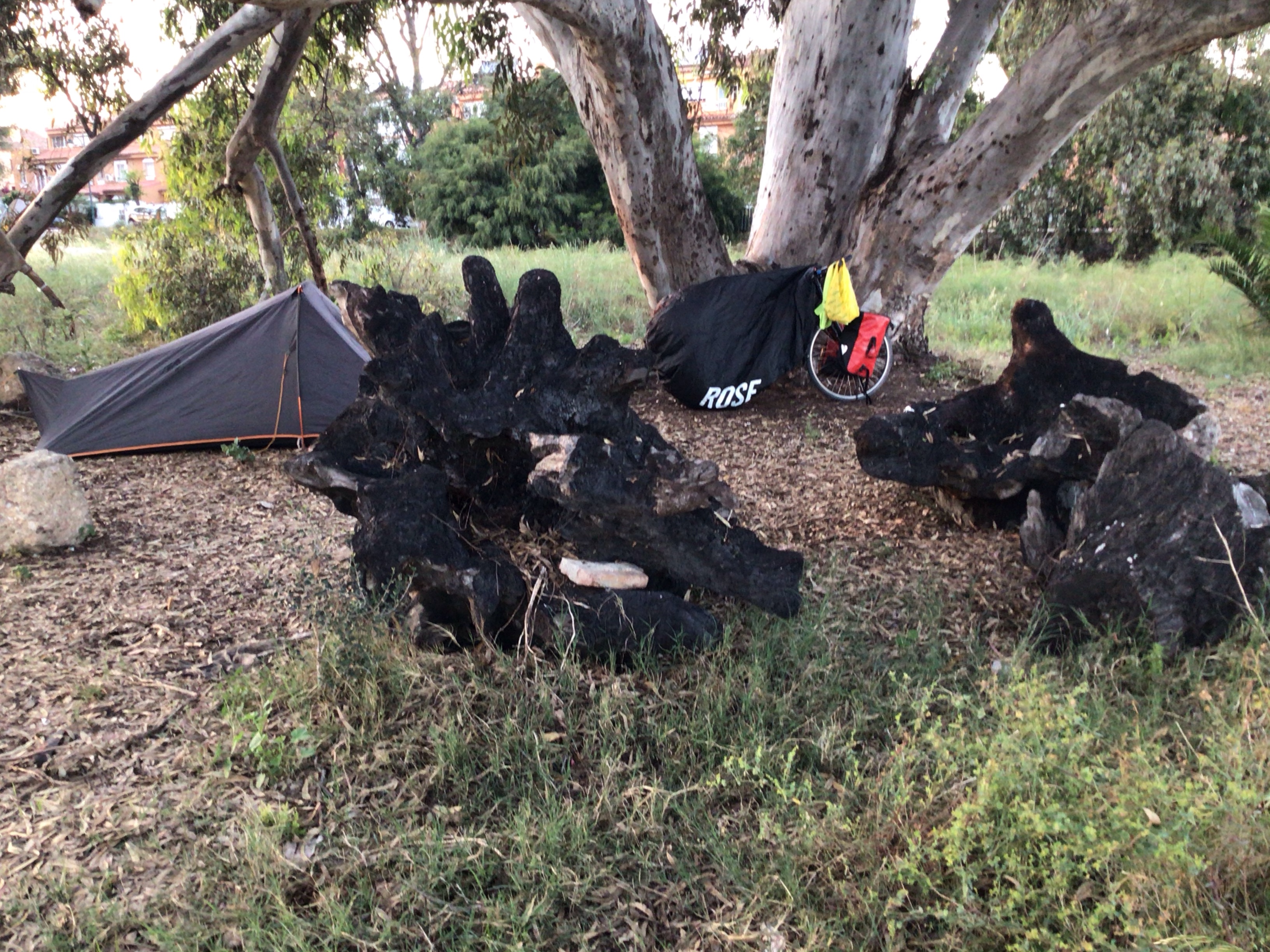 Après m’être arrêté boire ma bière-récompense, je poursuis donc mon chemin en commençant à chercher un endroit pour la nuit. Mais que nenni ! Les stations balnéaires s’enchaînent les unes après les autres. Même chose pour les cafés, restaus et hôtel minimum 4*. Impossible de dégoter un bivouac dans cette zone touristique. Je continue mon chemin et finis par arriver en-dessous de l’aéroport de Malaga – Costa del Sol ! En suivant la plage, je finis par tomber, d’abord sur un endroit fréquenté par les homos du coin, puis sur no man’s land où je peux enfin planter ma tente à l’abri d’un vieil eucalyptus. Il était grand temps.