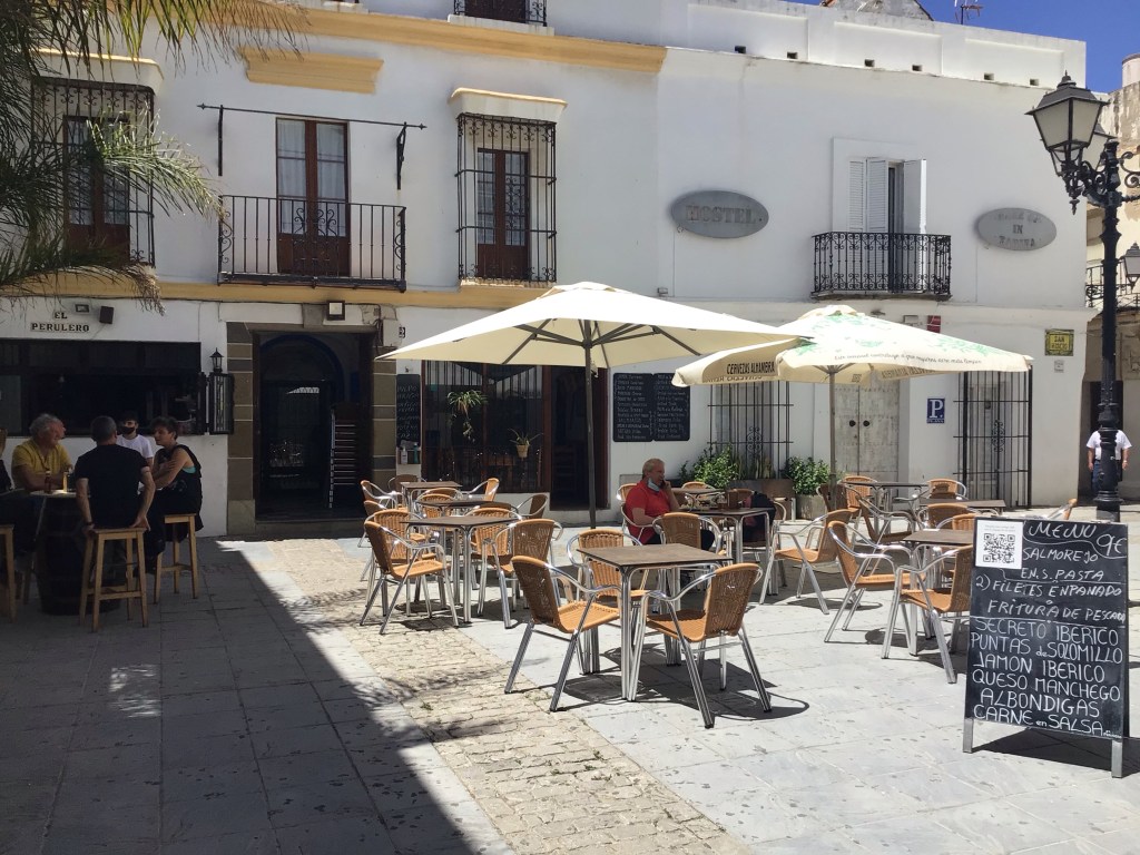 Je reprends la route goudronnée et finis par rejoindre la nationale N-340. A un moment, je veux bifurquer à nouveau pour longer les plages mais je me retrouve bloqué par un bras de mer. Tant pis. Je vais jusqu’à Tarifa par cette grande route. Le vent a refait son apparition. Et ça souffle à nouveau fort. Arrivé à Tarifa, je me pose dans un restau, pour mon menu del dia, sur une petite place à l’intérieur des remparts.