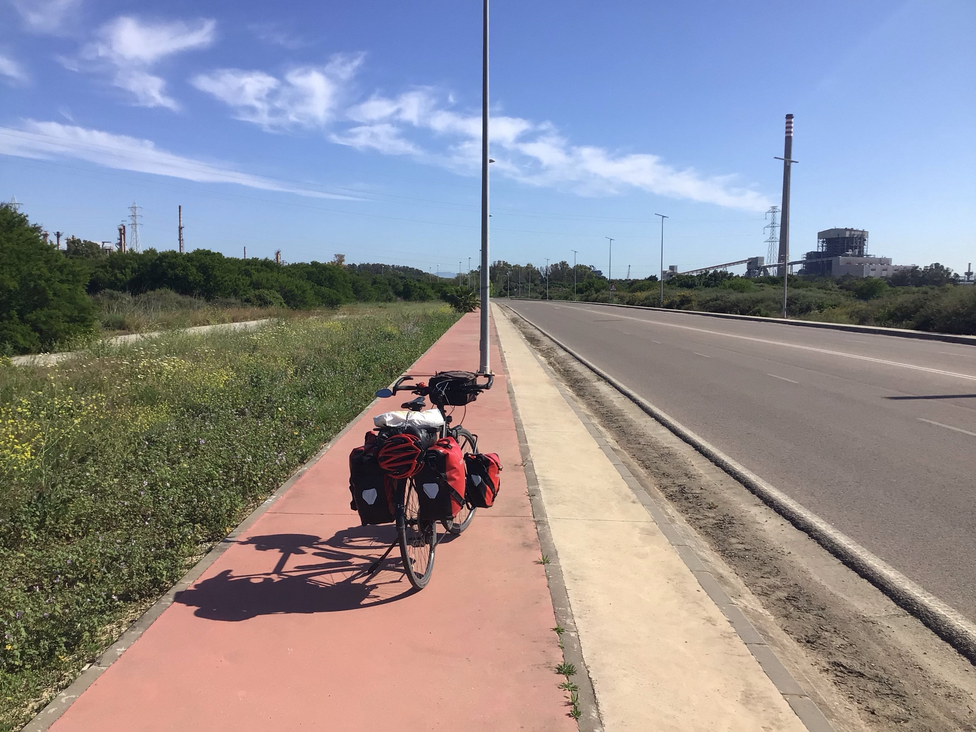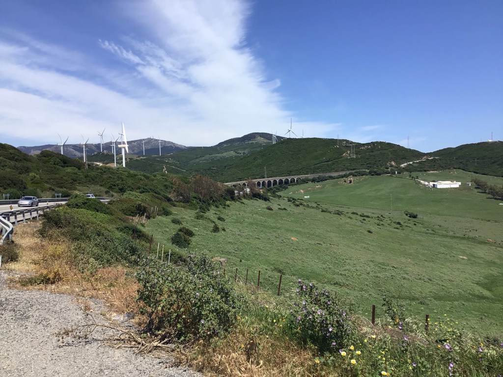 Par contre, après cela devient nettement plus compliqué voire critique. Mon GPS m’emmène sur l’A-7 (autoroute de la Méditerranée) afin que je puisse traverser le seul pont qui enjambe le Rio Palmones. Je n’ai pas le choix. Je reste à droite et je sers les fesses. Je reçois quelques coups de klaxons. Une fois sorti de ce merdier, j’arrive à Palmones en suivant une voie de service qui longe cette autoroute. Là, j’ai droit à la traversée de zones commerciales immenses. Puis le GPS me renvoie sur l’A-7. Je me pose et regarde mes cartes. Je préfère descendre le long du golfe de Gibraltar. Maintenant, ce sont des zones industrielles (gaz, panneaux solaires, …) que je me tape. Il y a quand même des cyclistes qui roulent par là et des gens sur la plage. C’est délirant.