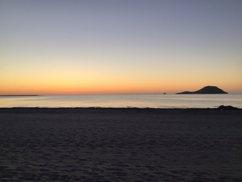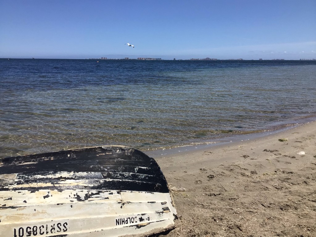 Par contre, juste sur le ponton d’à côté, j’entends parler français. J’interpelle la femme. Elle est effectivement Lyonnaise et aménage un bateau pour faire du « traîne-gogo ». Cela fait 4 ans qu’elle a largué les amarres. Elle s’appelle Angélique (Marquise des Anges ?). Comme elle connaît du monde dans le port, elle appelle un de ses amis qui pourrait me faire la traversée. Hélas, il est sur un chantier et ne peut pas. On discute un long moment de nos parcours respectifs. Puis je dois me résoudre à rebrousser chemin. Heureusement, le vent ne s’est pas encore levé. Au bout d’1h30 et 28kms, je suis sorti de la baie et revenu à Los Nietos, mon point de départ d’hier en fin d’après-midi. J’y retourne mes superbes promotions d’immeuble. Je n’ai plus qu’à contourner la baie pour poursuivre ma route vers le nord-est.