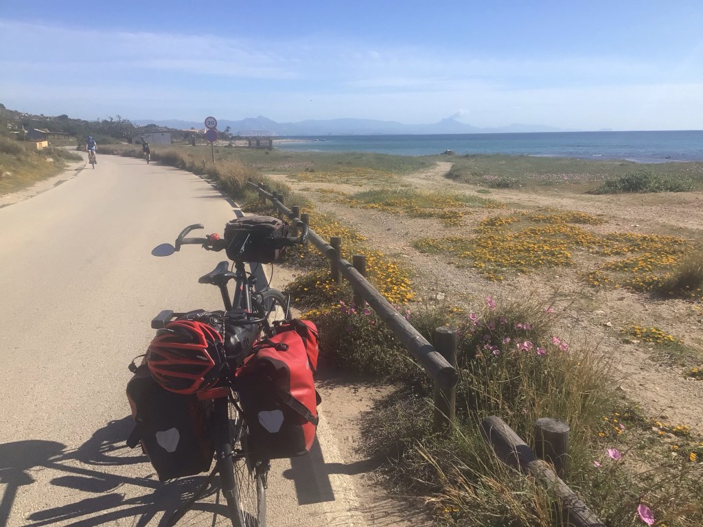 Puis je reprends ma route vers Alicante en suivant la piste cyclable le long de la N-322. Je passe au sud des marais salants comme me l’a conseillé un VTTiste espagnol, portant maillot de la Hollande, croisé sur mon chemin. Ce n’est vraiment pas ce que je préfère mais je n’ai pas trop le choix. Où alors, il me faut suivre mon GPS et passé par l’intérieur. A la sortie des marais, je prends la direction de Santa Pola et de la côte. J’y ai repéré une petite route qui m’a l’air plutôt sympathique. C’est le cas ! Je suis donc El Cami del Carabassi et arrive en vue d’Alicante au fond. Par contre, pour une fois, le vent est contre moi.