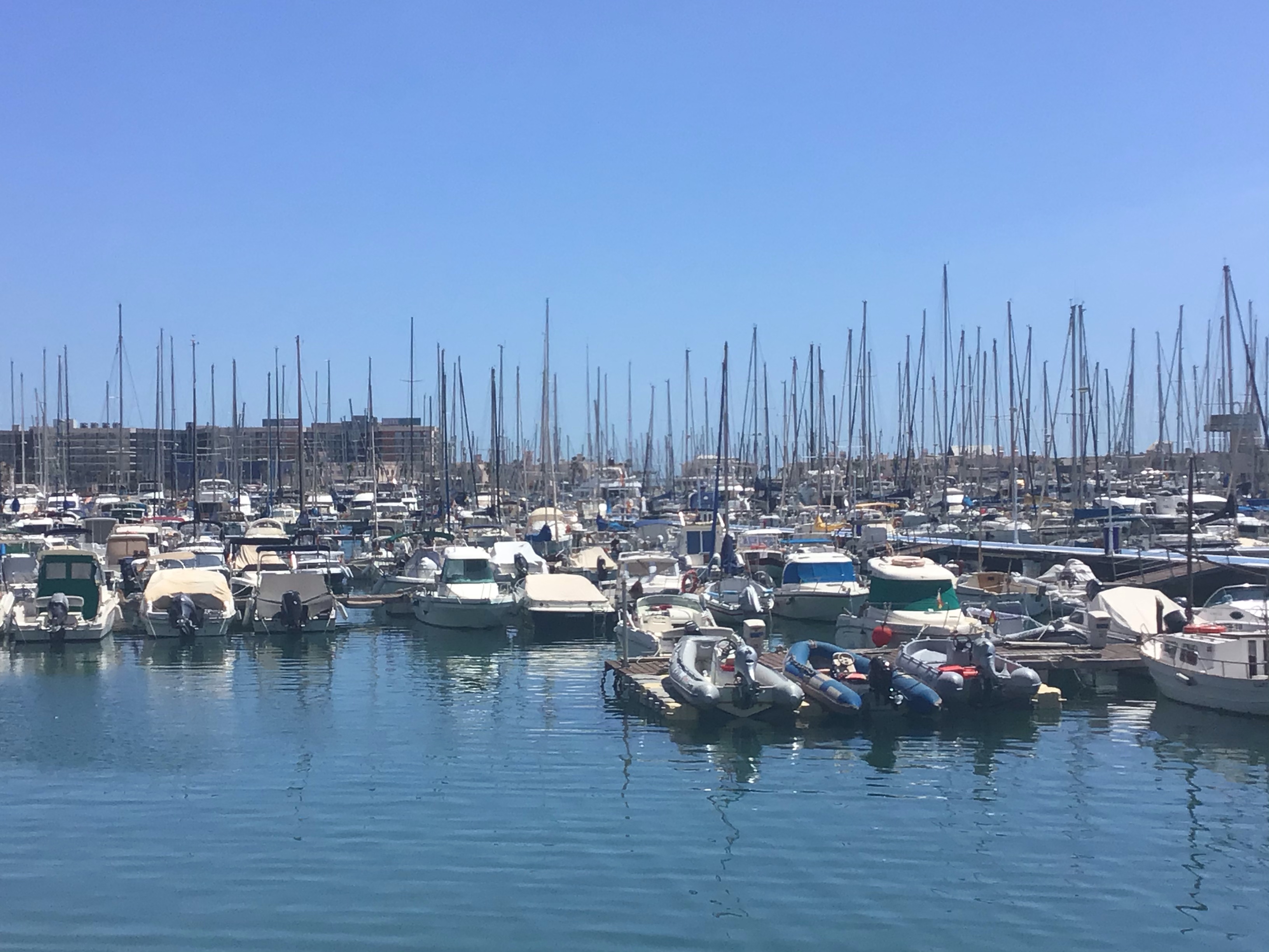 Je suis toujours impressionné par le nombre de personnes qui fréquentent ces cafés : ouvriers, employés, costumés, retraités, … et qui prennent leur collation matinale. Allez, ce n’est pas le tout mais il me faut reprendre ma route. Je finis par arriver à Alicante en fin de matinée. A défaut de forêts d’eucalyptus ou de pins, je tombe sur des forêts de mâts.