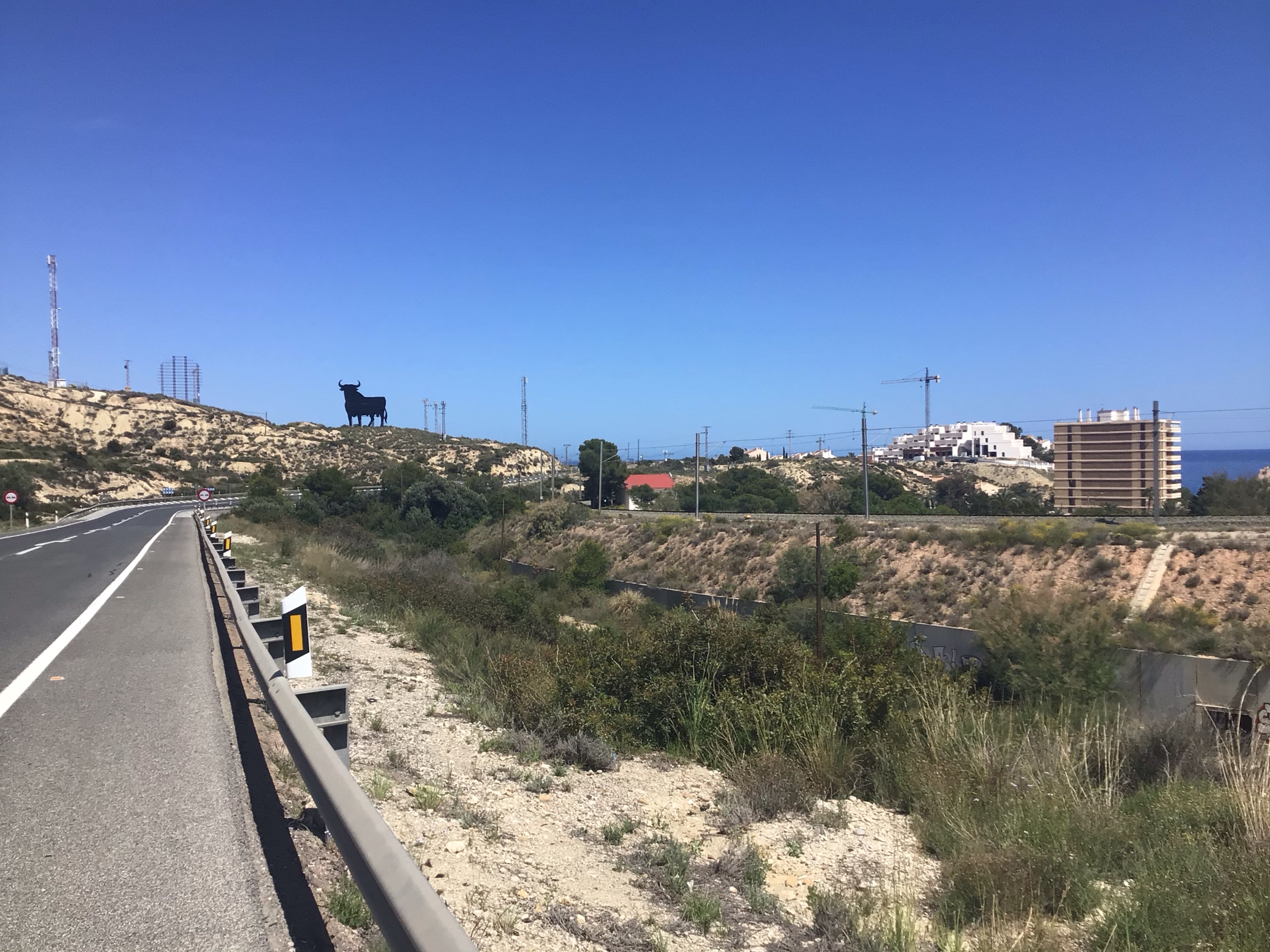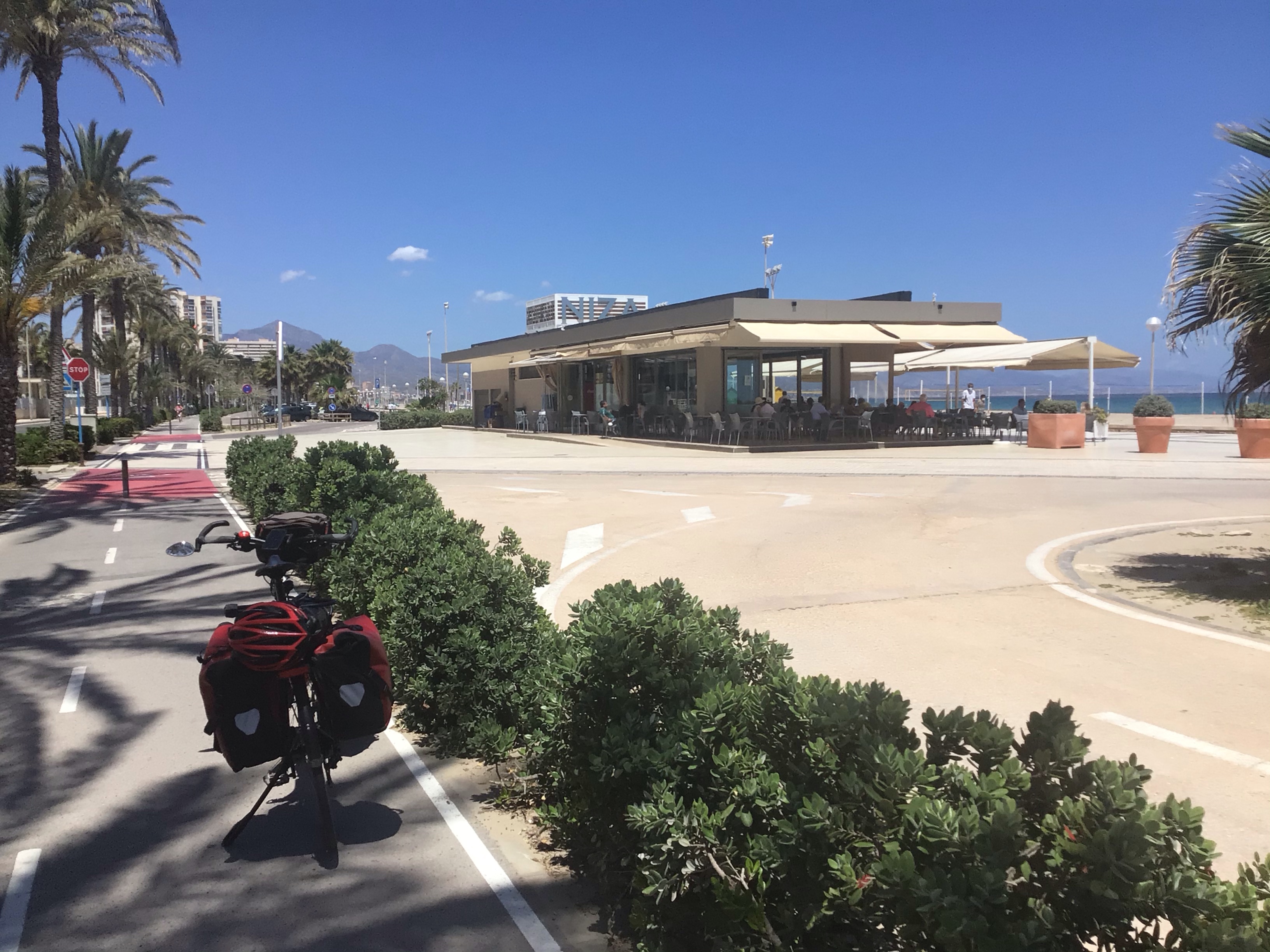 Puis j’emprunte une belle piste cyclable qui inaugure bien mon entrée dans Alicante mais ce sera de courte durée hélas. Par contre, les restaus sont toujours autant blindés. Je suis la côte jusqu’au Cabo de la Huerta. Puis il me faut rejoindre ma chère N-332 parce que la côte devient vraiment trop découpée après.
