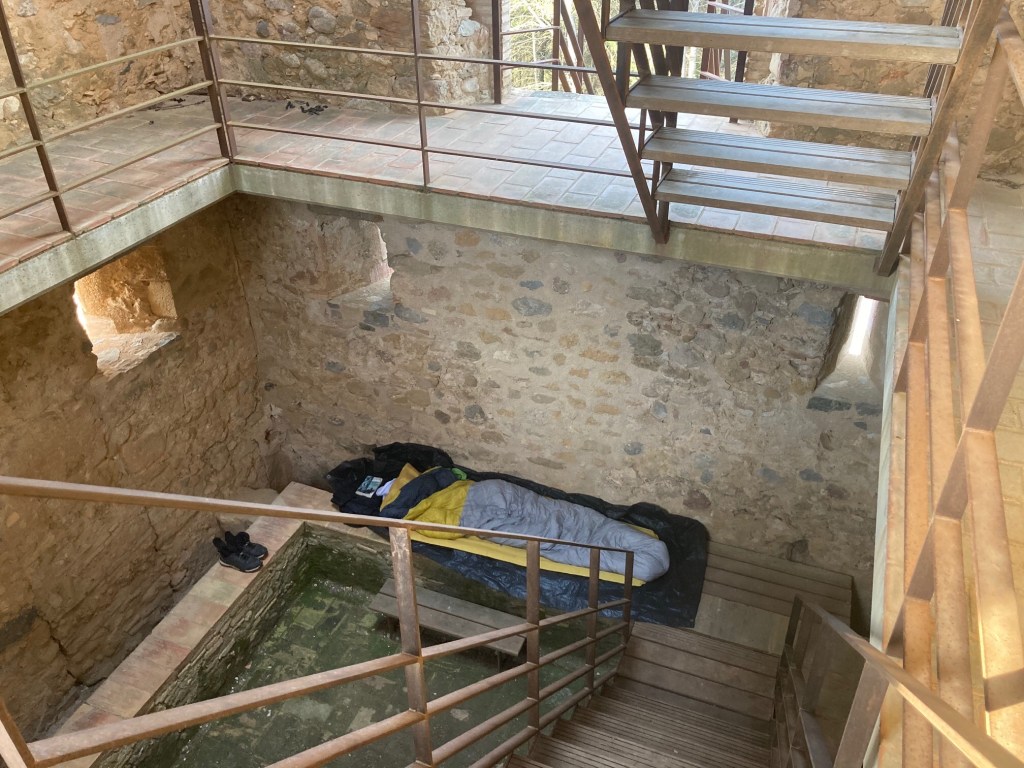 Réveillé par les rayons du soleil qui perce à travers les meurtrières, je me sors de mon duvet pour cette dernière matinée en Espagne. Je monte sur ma terrasse pour y déjeuner. Las, le gaz est à plat comme le bonhomme et le frigo. Il est temps de rentrer et de reconstituer les stocks.