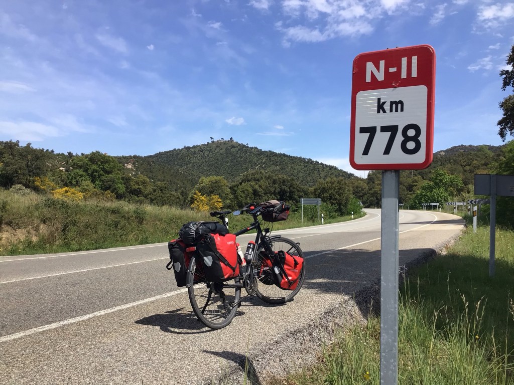 Arrivé à La Jonquera, j’évite la zone des grands commerces que j’affectionne pourtant particulièrement et m’arrête dans le centre pour y boire mon café. Je profite une dernière fois de mon café et mes tostadas con tomate y aceite ainsi que de l’ambiance. Je repars et monte jusqu’au col du Perthus. Plus que quelques hectomètres et je serai de retour en France après cette circonvolution ibérique.