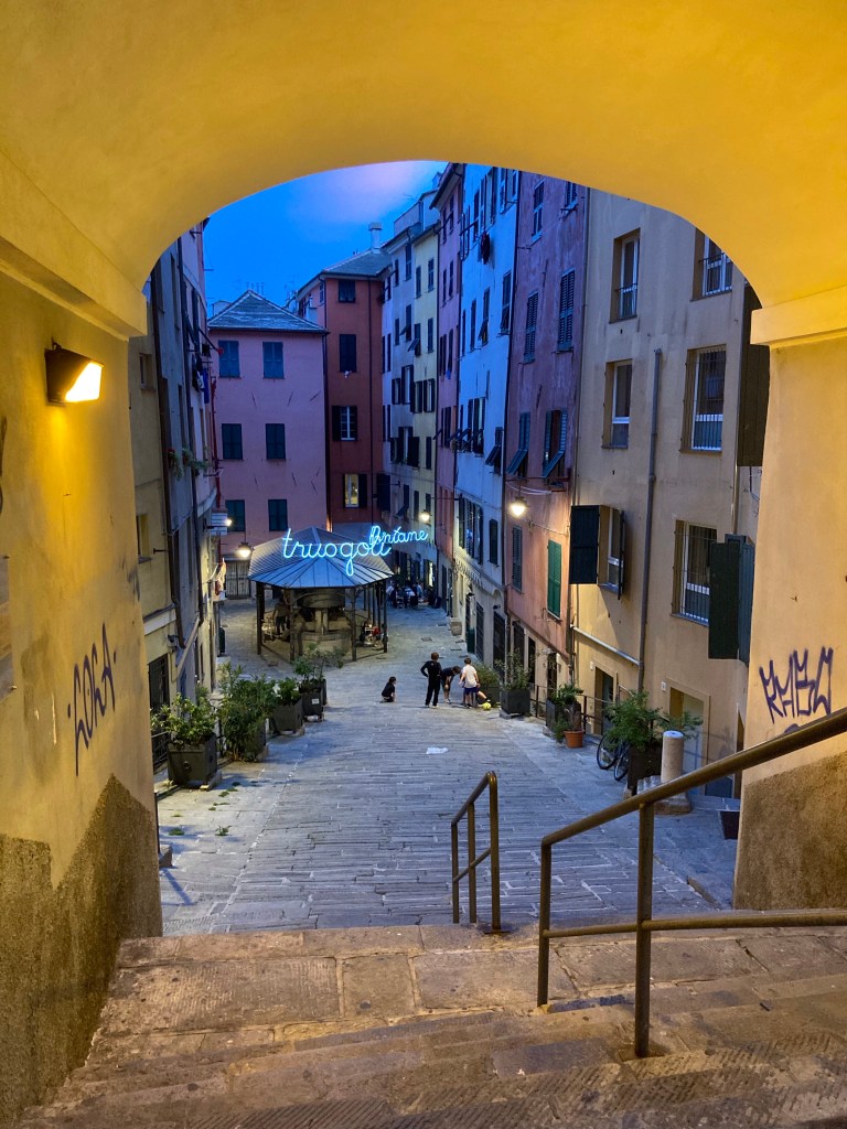 En effet, j’ai décidé de ne traverser ni le sud de la France (parce que je l’ai déjà parcouru à plusieurs reprises et des itinéraires variés pour aller voir mon frangin à Ampus dans le Haut-Var), ni la Ligurie (parce que j’y étais passé deux fois en voiture pour me rendre à Florence et je ne gardais pas un super souvenir de cette côte et de sa route très étroite). J’ai donc ciblé Gênes où je viens d’arriver après un voyage en train depuis Les Arcs-Draguignan, changement à Cannes puis à Vintimille pour arriver dans la soirée à destination de mon Airbnb à 2 pas de la gare.