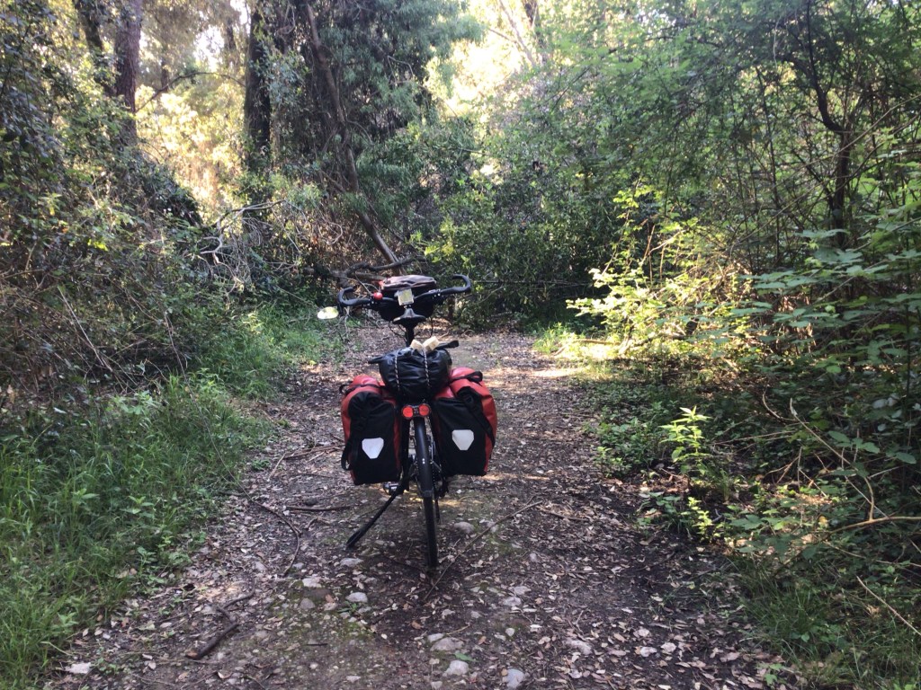 Arrivé dans cette ville au nom improbable, je fais une infidélité à mon Schweppes Tonic et m’arrête dans une gelateria. Je me tape une piccolo (2 boules à 2€) avec cioccolato fondente e crema di pistaccchi : une véritable tuerie ! Il est déjà 17h00. Je vais faire quelques courses avant de reprendre la route et songer à trouver un nouveau bivouac. J’emprunte à nouveau une belle piste cyclable qui longe la SP39 jusqu’à Mazzanta. Comme les stations balnéaires se succèdent à nouveau avec son lot de campings immenses, je jardine un peu avant de me diriger vers la Riserva Naturale Biogenetica Tomboli di Cecina où je trouve mon bonheur dans une forêt de pins méditerranéens derrière une dune qui donne sur la mer. Il y a même une table où je pourrais manger assis. Par contre, comme sur mes précédents bivouacs, les moustiques tigres sont aussi de la fête ! Quelle saloperie ces bestioles …