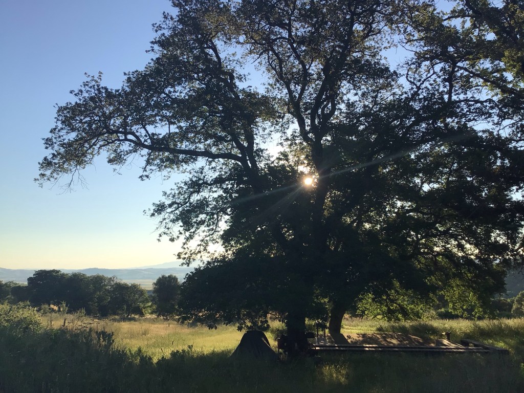 Ayant orienté ma tente plein est, je suis à nouveau réveillé aux aurores. Je me lève à 6h30. La nuit a été douce. Le soleil tape déjà. Le ciel est immensément bleu. Je suis frais et dispo après avoir dormi comme un bébé à l’ombre de ce majestueux chêne centenaire. Quel magnifique bivouac !