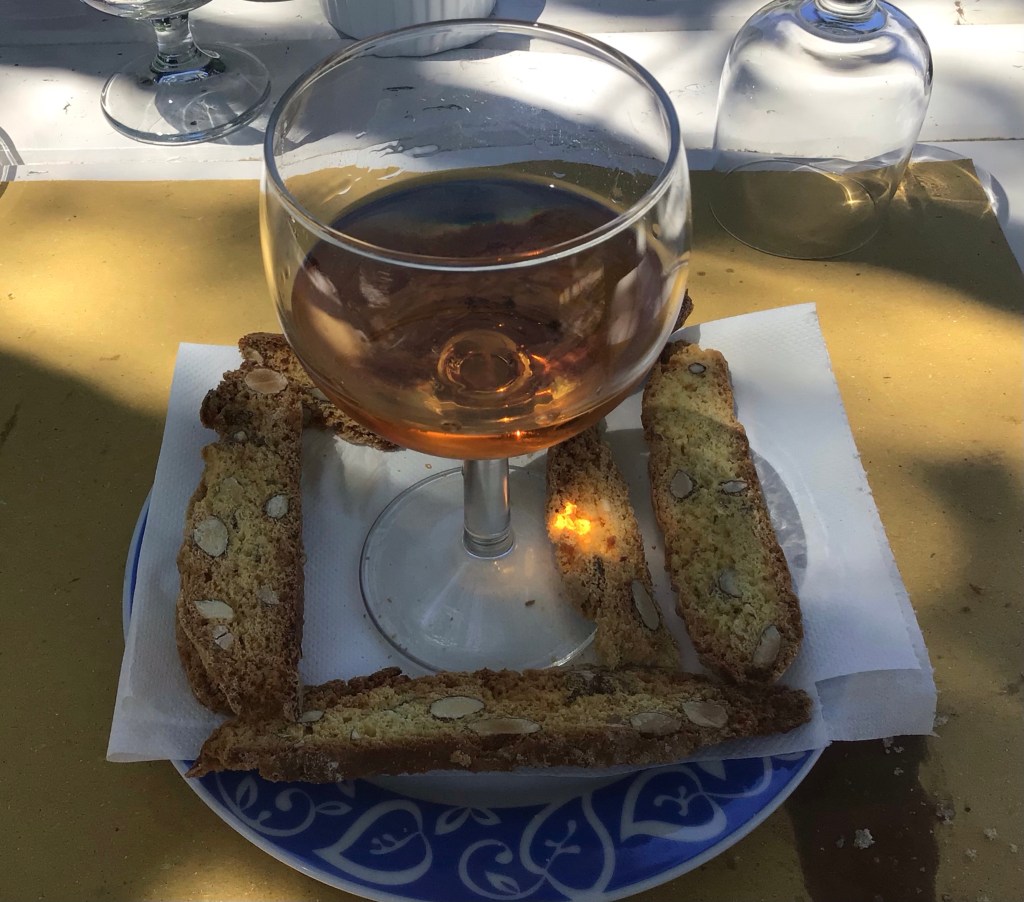 Au sujet du pain acheté dans les boulangeries locales depuis mon arrivée en Italie, je ne le trouve pas extra. Il est sans sel et sans air. Par rapport aux pains confectionnés par mon ami Gilles dans sa boulangerie-pâtisserie de Gratentour, c’est le jour et la nuit. Si vous avez l’occasion, passez et dites que vous venez de ma part (sa femme Pascale tient la caisse). Ils ont également une excellent jeune pâtissière. A ce sujet, je choisis un dessert dont je ne connais pas le nom. Le jeune serveur a beau essayé de m’expliquer, je ne comprends pas. J’aime bien les découvertes même culinaires. Effectivement, quand il me l’amène, la surprise est bonne ! C’est du Vin Santo, vin doux de Toscane servi avec des cantucci (biscuit sec à base d’amandes). Par contre, je crains un peu quand je vais remonter sur le vélo …