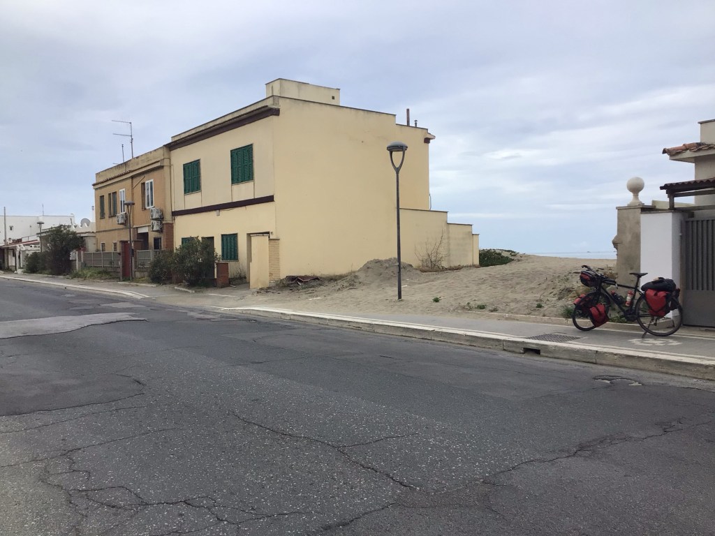 Puis je retrouve la mare et de petites stations balnéaires calmes et paisibles. Je m’arrête dans l’une d’elle à Borgo Sabotino dans la province de Latinia. J’y fais quelques emplettes pour mon déjeuner sur la plage : pizza, croquette de riz, yaourt et une bouteille de Peroni (66cl) pour la modique somme de 6€. Ils poussent quand même un peu à la consommation de bières vu le prix de la bouteille ! Je m’installe sur un tronc d’arbre et admire le paysage tout en observant les gens. D’ailleurs, je suis abordé par un black parlant français. Ils sont quelques-uns à arpenter les environs pour essayer de fourguer leur camelote. Il me dit qu’il n’a pas trop le choix. Ce que je comprends aisément. On discute un long moment et, pour me remercier, il me laisse un bracelet en cadeau. Sympa !