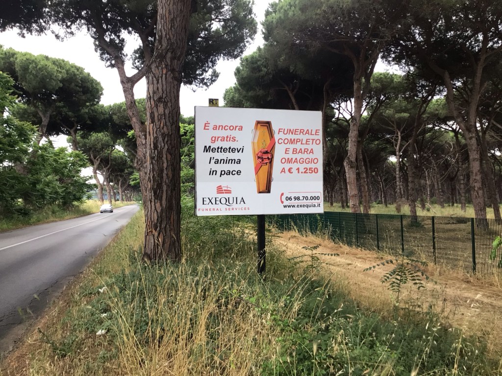 Alors que les véhicules continuaient de me raser les miches au risque de m’envoyer au paradis des cyclistes, des publicités pour une entreprise d’obsèques vantaient ses mérites et ses tarifs !