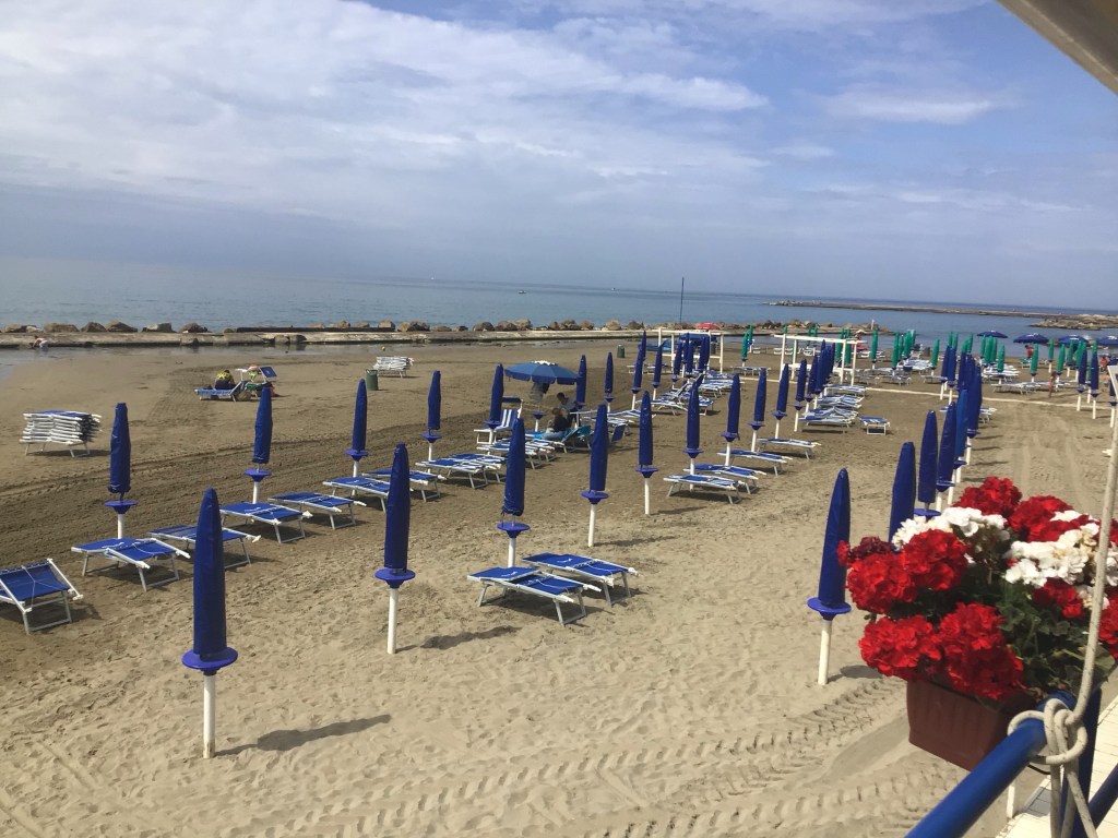 Un véritable cauchemar, vous dis-je. Et c’était vraiment affreux, sales et méchants (routes). Heureusement, au bout d’un peu plus de 2 heures, je me suis enfin éveillé. J’ai bu un bon café américain accompagné d’un beignet au chocolat dans la jolie station balnéaire d’Anzio. Le ciel était à nouveau bleu. Le temps était beau. Les amoureux en terrasse se disaient des mots doux. Les gens souriaient. J’étais au bord d’un petite plage où les familles commençaient à s’installer en ce beau samedi printanier.
