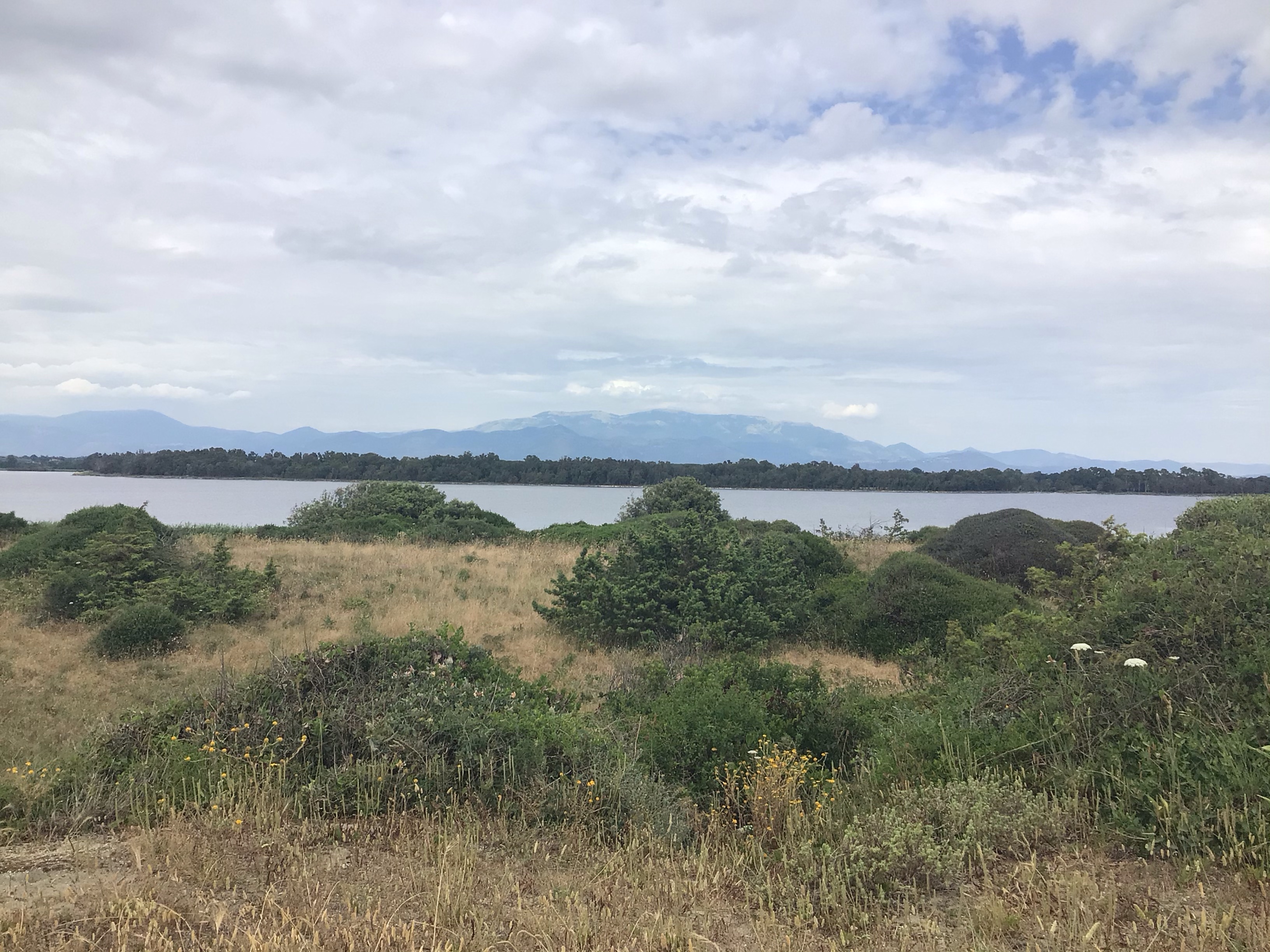 J’emprunte toujours la strada Lungomare qui longe la mer comme son nom l’indique ! De l’autre côté de la route se trouvent de grands lacs : lago di Fogliano, lago dei Monaci e lago di Caprolace. Puis derrière ces lacs, la plaine et des montagnes au loin. Il y a beaucoup moins de monde que hier. Par contre, le stationnement est toujours payant et les pervenches veillent.