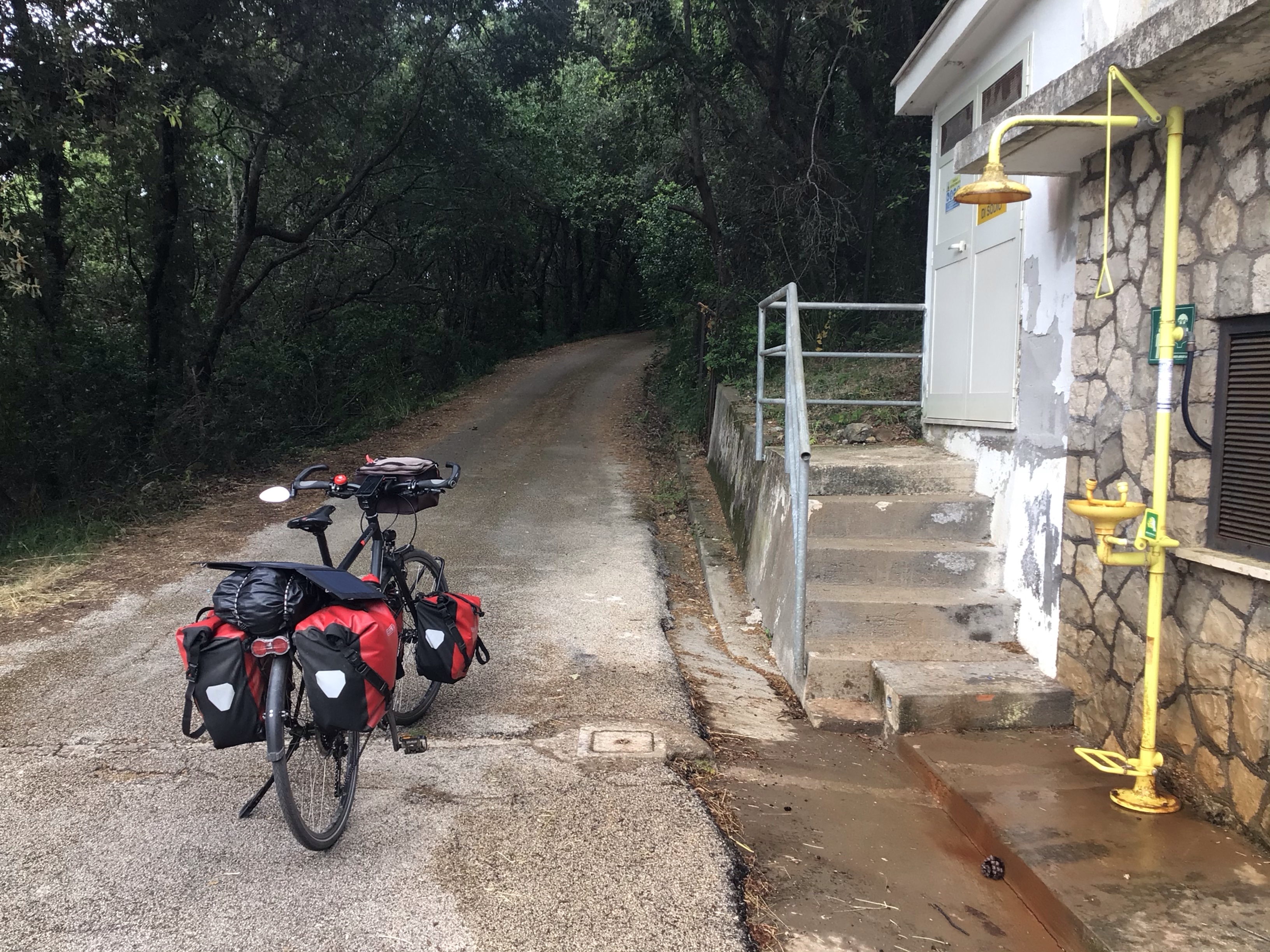 J’arrive en vue de la pointe que j’aperçois depuis un long moment. Le village au pied se nomme Mezzomonte. Je m’y arrête boire une boisson sucrée, manger une banane et faire le point sur la situation. De l’autre côté de la baie, je ne repère qu’une plage immense avec d’innombrables quadrillages représentant certainement des lotissements. Je pense que cela ne va pas être facile de trouver un bivouac par là. L’autre possibilité est de grimper en haut du massif. Vu que la journée a été sans relief, un peu de dénivelé ne me fera pas de mal ! Je trace ma route via mon GPS et attaque la mezzo monte … En bas de cette montée se trouve un bâtiment devant lequel il y a … une douche qui fonctionne parfaitement. C’est vraiment dommage qu’elle ne soit pas en haut du promontoire. Et aussi une arrivée d’eau. J’en profite pour refaire le plein et attaque. Il n’est que 17h mais la frondaison et l’étroitesse de la route rend cette montée magique.