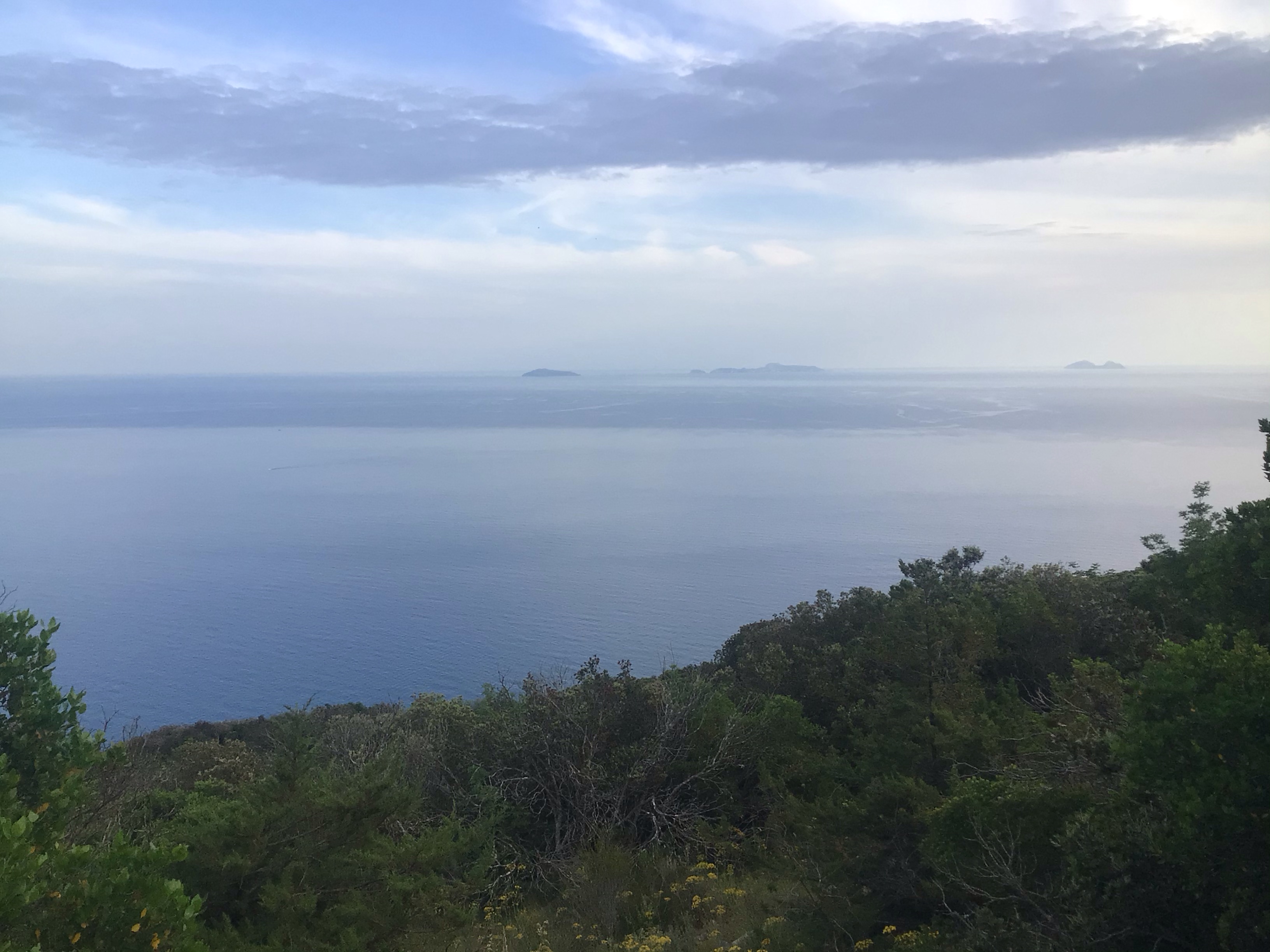 Tant que j’y suis, je grimpe jusqu’au Monte Circello où se trouvent des antennes militaires. Je suis tout à gauche à 6km/h mais il n’y a pas de gros pourcentages et c’est assez régulier. Cependant, les quelques randonneurs, cyclistes et automobilistes que je croise doivent me prendre pour un grand malade. Ce qui n’est pas complètement faux … Par contre, la route est hyper escarpée et il n’y a pas de replat où bivouaquer. Je trouve juste un endroit en bordure de route qui fera l’affaire. Je me pose, me lave, me réhydrate avec ma Peroni du soir bien méritée et dîne dans une quiétude extraordinaire et devant la mer qui s’étend à l’infini devant moi. Quel pied !!! Devant moi, 3 îles émergent dont la principale Isola di Ponza.