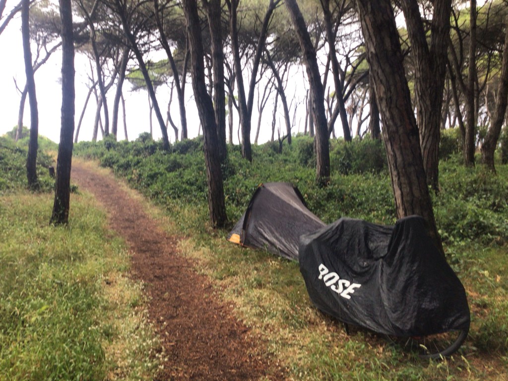 Réveillé vers 6h15, il ne pleut plus. Mes affaires sont sèches. La tente, à couvert des pins, a bien résisté aux trombes d’eau. Par contre, je trainasse un peu trouvant qu’il est un peu tôt pour me lever. Et évidemment, quand je me décide, il se remet à flotter. Je n’ai plus qu’à patienter en pliant mes affaires et attendant une accalmie. Puis je plie mes gaules toutes trempées et je reprends la route dans cette région de Campanie qui a débuté en franchissant la rivière Garigliano.