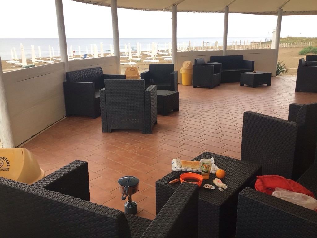 Après avoir tournicoté un moment pour trouver un accès libre (tout est encore barricadé !) à la plage, je finis par trouver mon bonheur dans un café fermé en bordure de plage. Je me tape un p’tit déj’ royal : orange, thé noir, céréales et compote de mangue, tartines au fromage, miel puis Nutella. Alors que j’ai plié mes affaires et que je consulte ma carte, le proprio débarque.