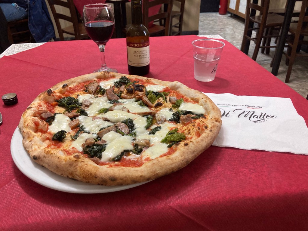 Après avoir pris un Spritz en apéro dans le quartier étudiant, je dîne dans une pizzéria conseillée par Luca (Pizzeria Di Matteo dans le centre historique). La pizza que je commande a été primée en 2012. Elle est effectivement délicieuse.