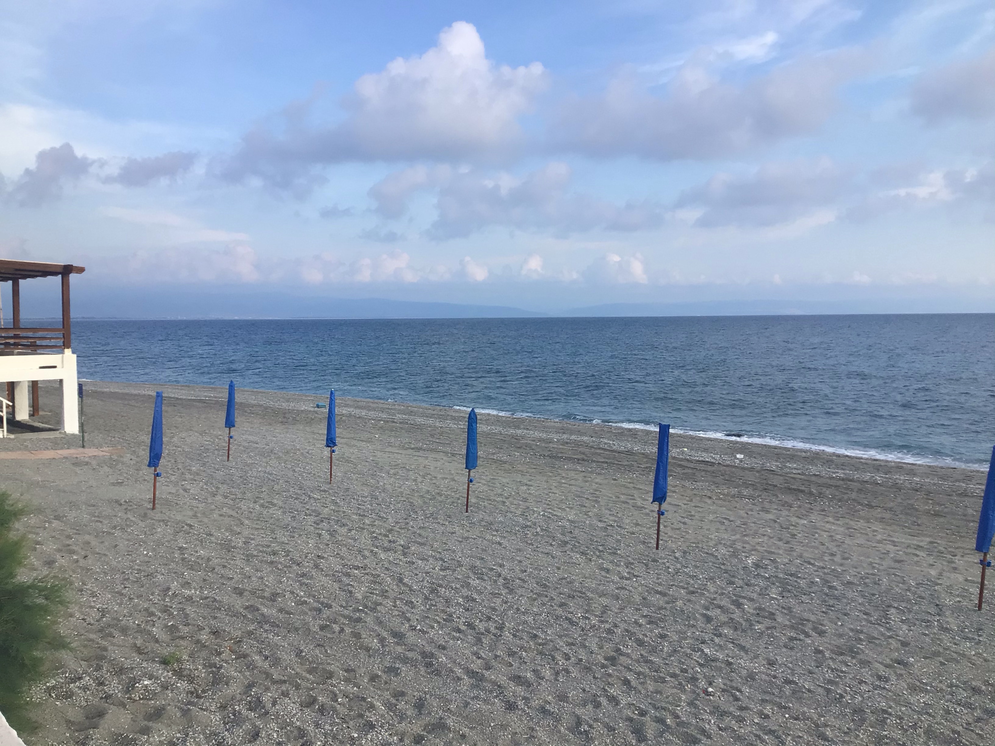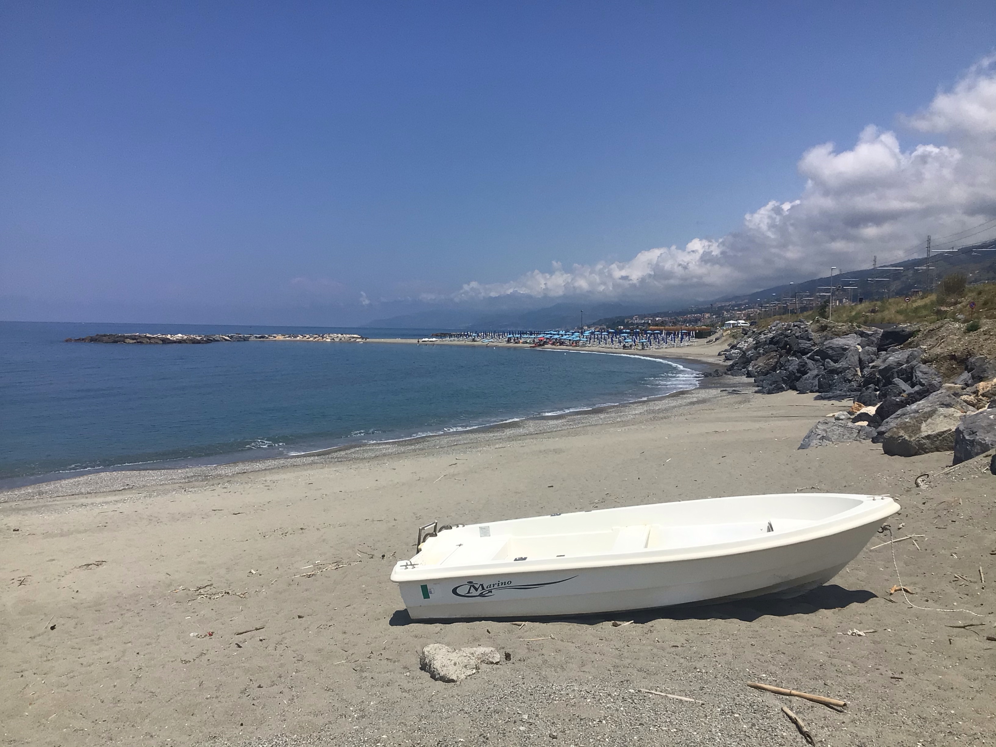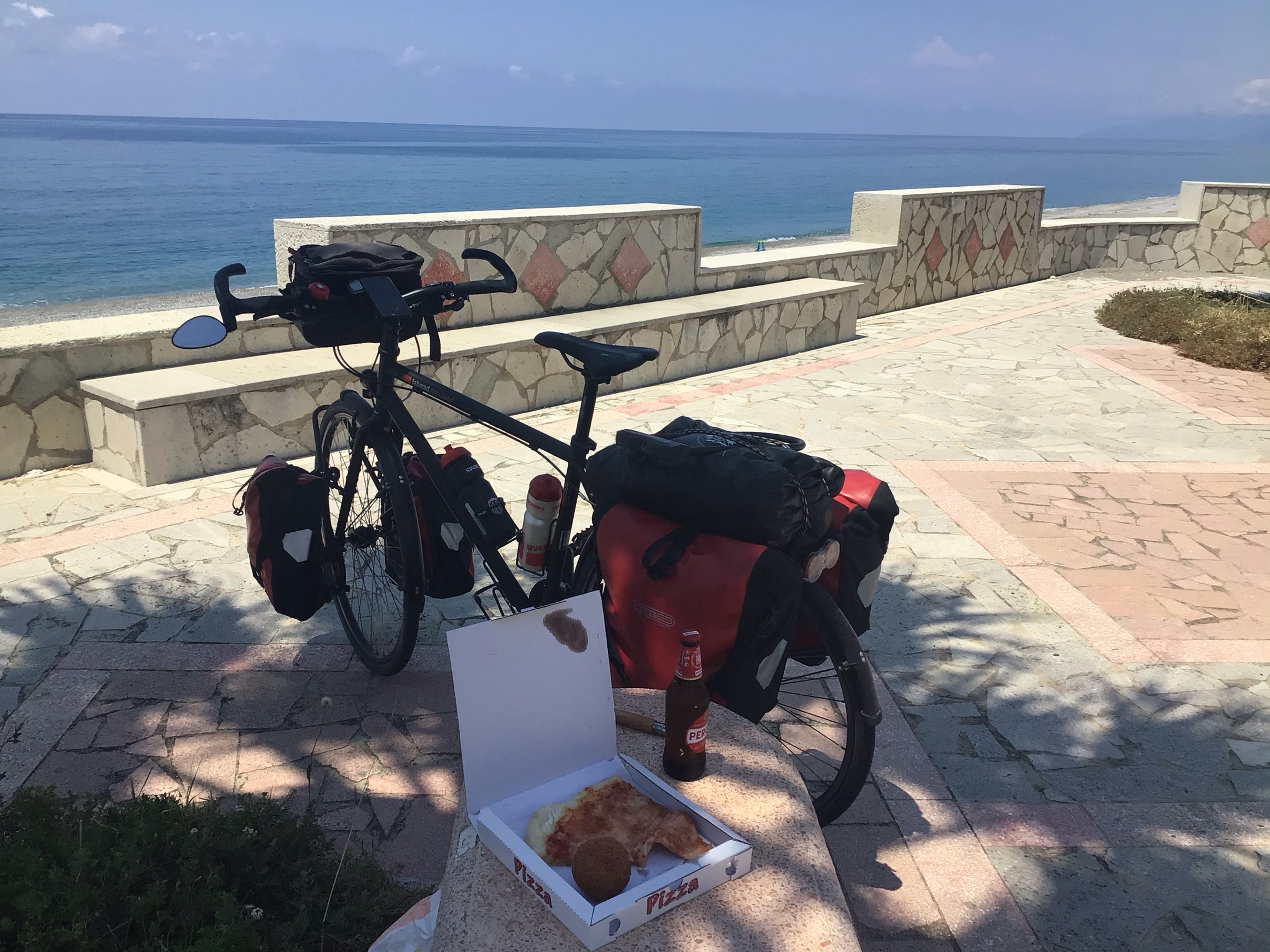 Mais je ne peux pas laisser mon vélo, mes sacoches et mes papiers sans surveillance; ni traîner le vélo sur la plage d’ailleurs. Je continue mon chemin à la recherche de ma pizza quotidienne et trouve mon bonheur dans une panetteria à Fiumefreddo Bruzzo (j’adore !). Je vais déguster mon pique-nique à l’abri d’un palmier en bordure de plage.