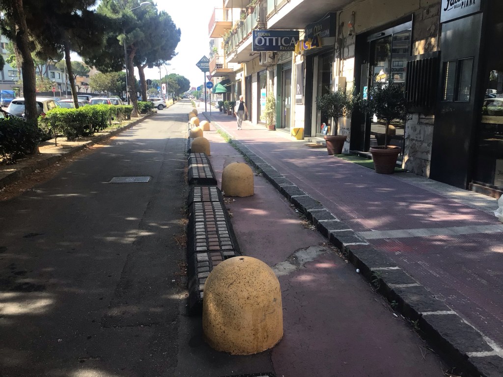 Par contre, après avoir contourné l’Aeroporto di Reggio Calabra de Ravagnese par de très mauvaises routes encombrées de poubelles, j’emprunte enfin une piste cyclable urbaine. Cependant, entre les énormes plots jaunes en béton et les séparateurs noirs qui sont déplacés tout le long, il faut vraiment avoir envie de rouler à vélo dessus. D’ailleurs, je ne vois que très peu de cyclistes urbains. Ou alors, certains circulent sur d’énormes vélos électriques. Je ne parle évidemment pas des scooters qui sont omniprésents dans toutes les villes.