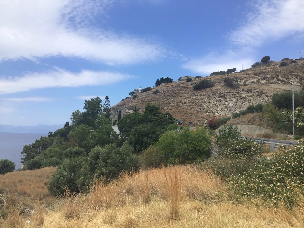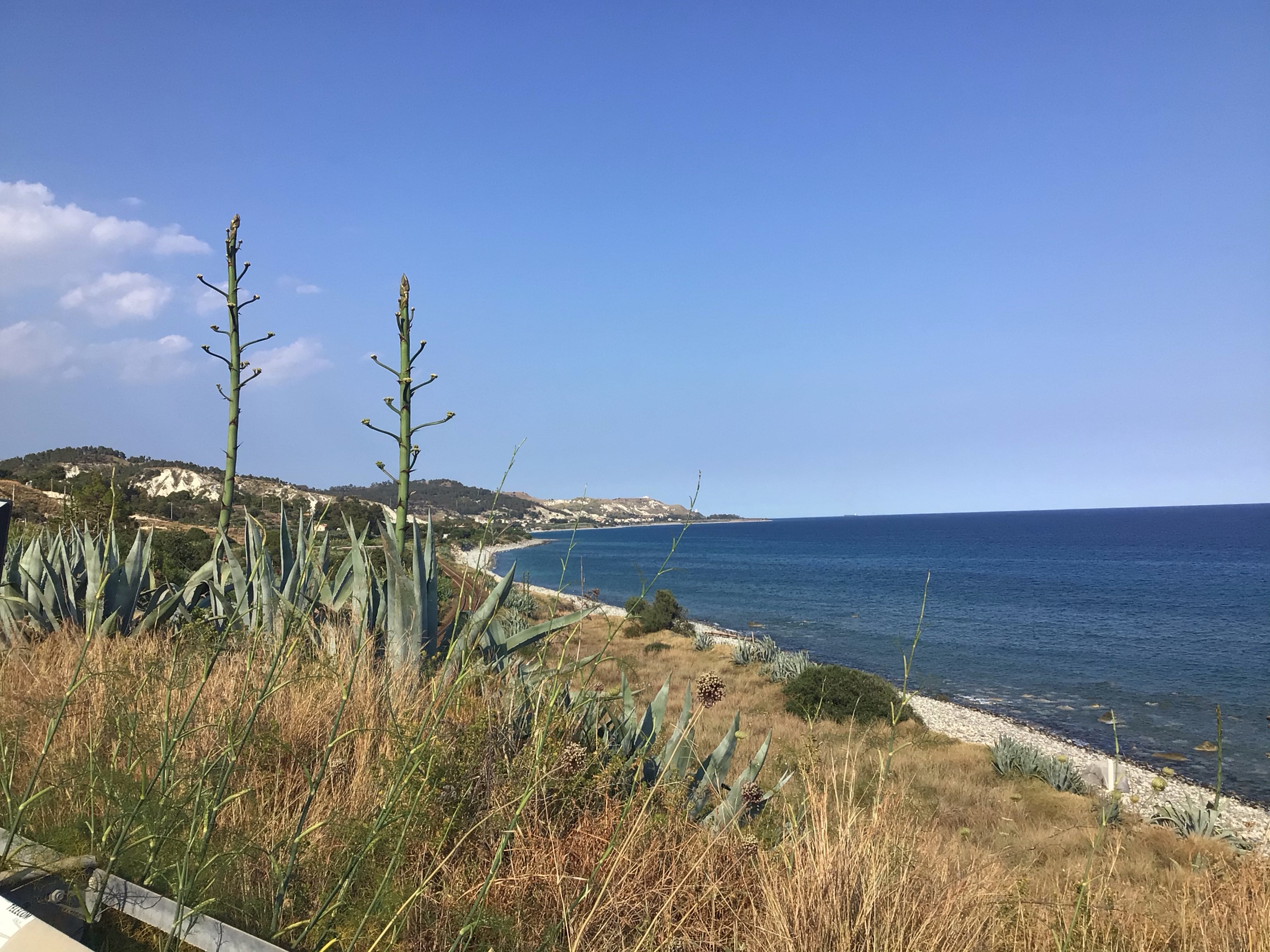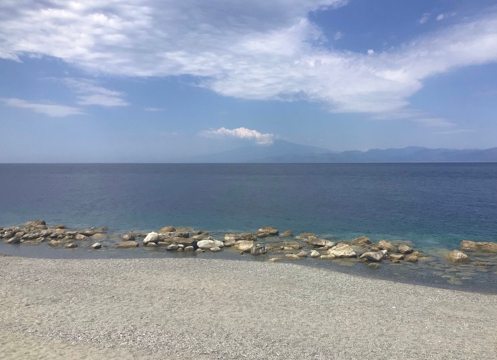 Finalement, après une cinquantaine de bornes en milieu hostile, je finis par arriver en milieu naturel en empruntant la route SS106 qui longe le bord de mer. Je profite de ne plus avoir de constructions devant moi pour immortaliser l’Etna qui se dresse du côté sicilien. Les nuages accrochent son sommet comme si une éruption allait se produire !J’espère pouvoir y retourner et y monter un de ces jours. Par contre, aucun regret par rapport à mon choix matinal.
