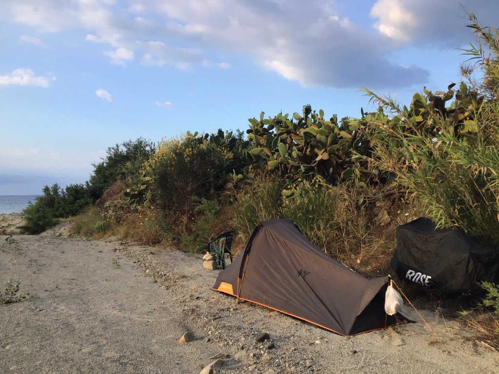 Même cérémonial que d’habitude avant de quitter ce nouveau bivouac vers 7h30 pour partir en direction de l’est et longer la Calabre du sud. Comme on trouve de tout sur les plages, hier soir, j’avais pu me rafistoler une chaise à trois pattes pour mon petit confort personnel.