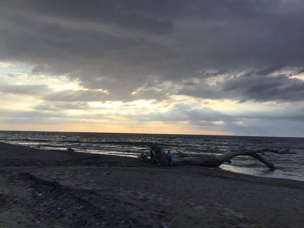 Malgré le bruit des trains qui ne passaient pas très loin sur un pont en fer, la nuit fût bonne. Ce matin, à mon réveil matinal, le ciel est menaçant sur la mer. Mon arbre couché est toujours là à résister aux vaguelettes de la Méditerranée.