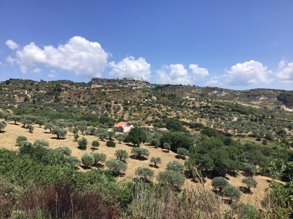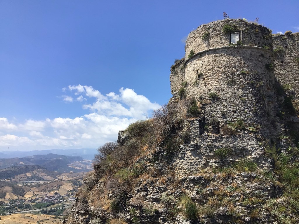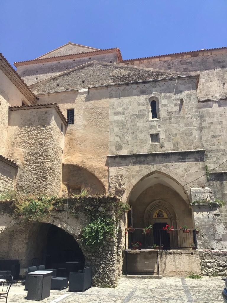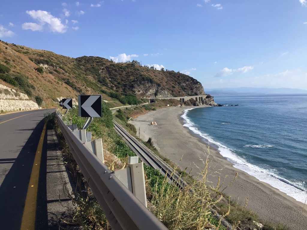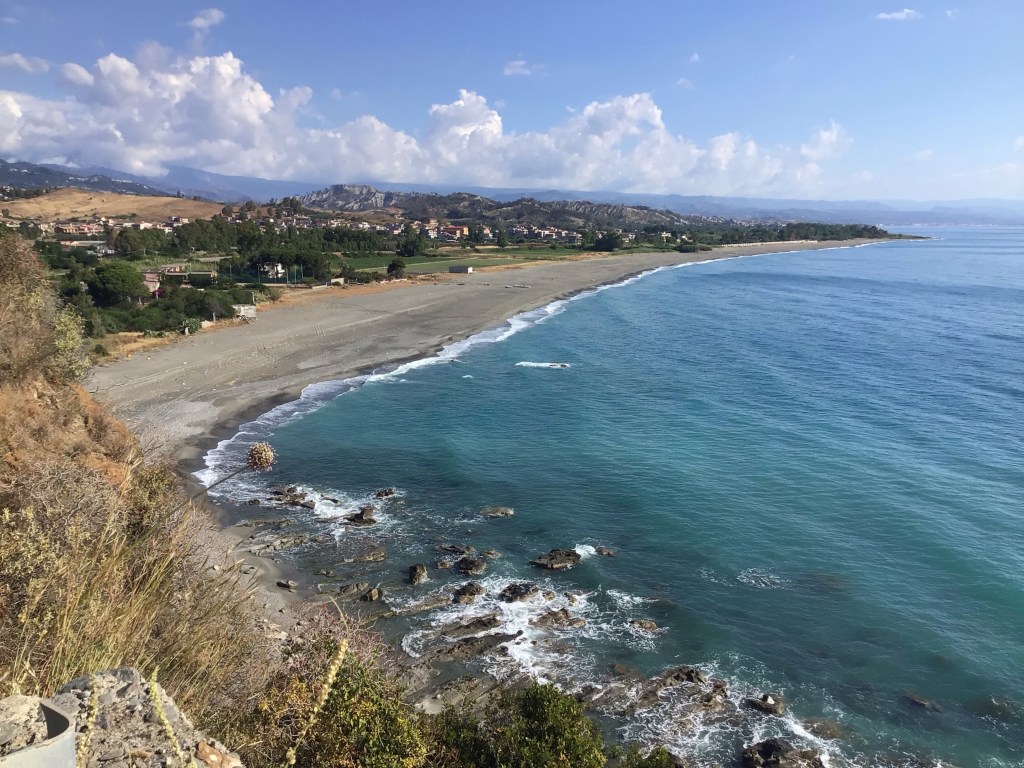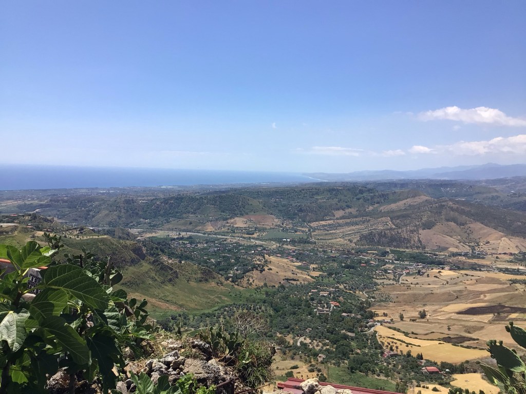 J’arrive en haut du village classé dans les 20 plus beaux villages italiens sis dans le Parco Naturale d’AstroMonte. La vue y est splendide de tous les côtés. La largeur de la péninsule doit être d’une cinquantaine de kms au vu du panneau qui indiquait la direction du port de Gioia Tauro au nord.