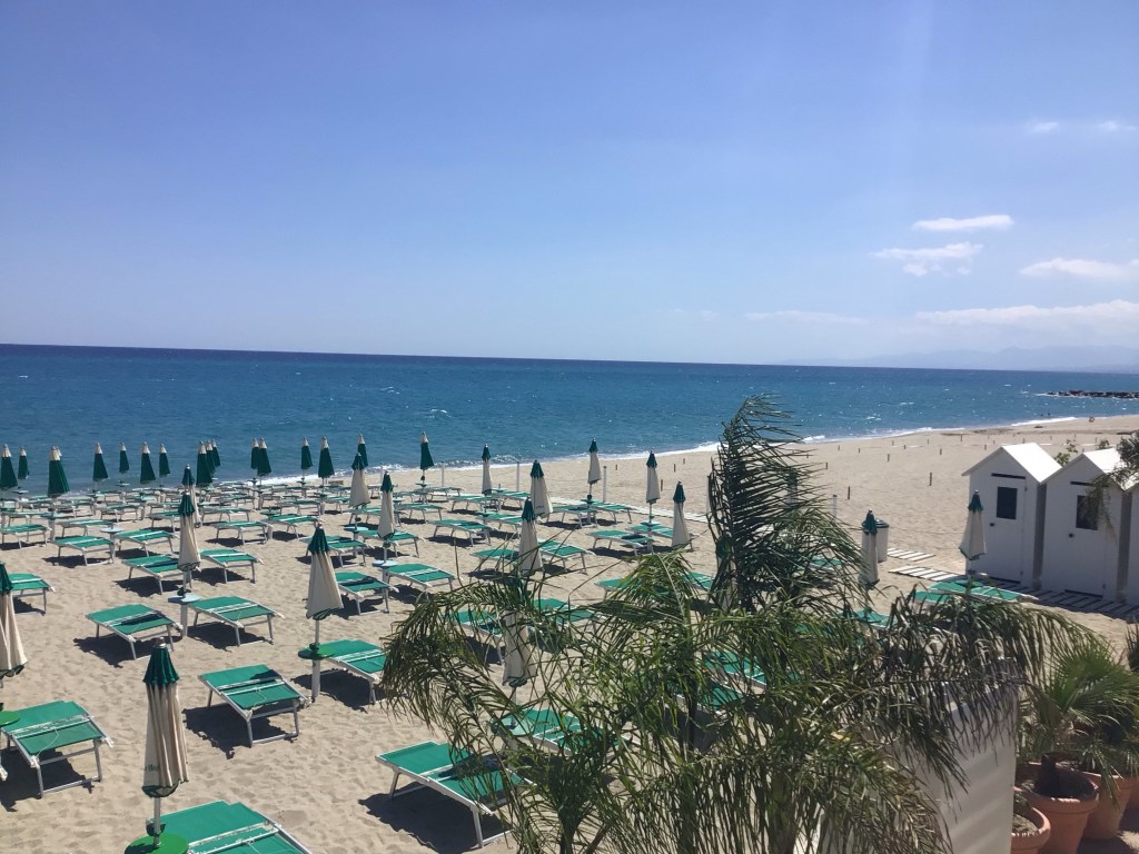 Puis il me faut redescendre sur le lungomare. Je retrouve ma SS106. Le vent qui vient de la mer s’est levé. Je l’ai de 3/4 face donc dans la poire. Je branche U2 à donf’. Je débranche le cerveau. Je mouline sur la plaque du milieu pour avancer à 16km/h environ. Je longe cette plage immense où il n’y a pratiquement personne. De temps en temps, je traverse un village avec un peu d’animation. J’essaie alors de prendre la promenade. Quelques Lidos font face à la mer. Mais personne !