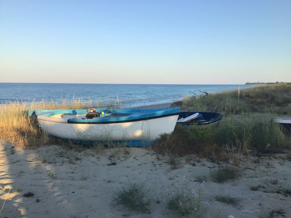 En fait, c’est le 1er match de l’Equipe de France de foot dans cet Euro2020 contre l’Allemagne. J’aimerais bien le voir mais il me faut trouver un camping avec bar-TV. Après 2 tentatives infructueuses, j’abandonne mes recherches et trouve un bivouac en sortant du village de Santa Catarina del Jonio. Je suis à nouveau en bord de mer et j’ai même une douche pour ma toilette du soir. Je profite également d’une barque pour dîner tranquillement et confortablement avant de rejoindre mes pénates pour une bonne nuit de récupération après cette longue journée.