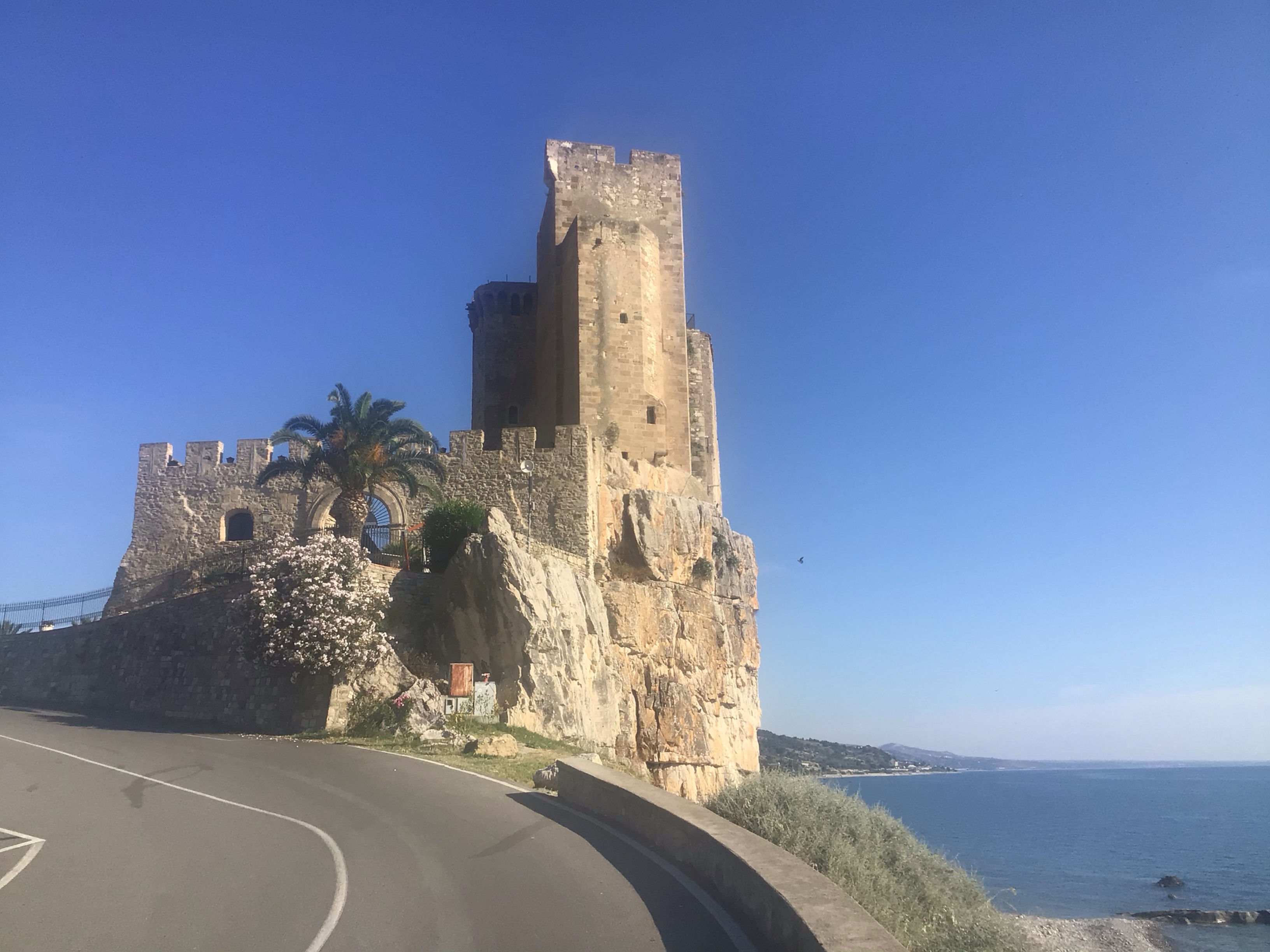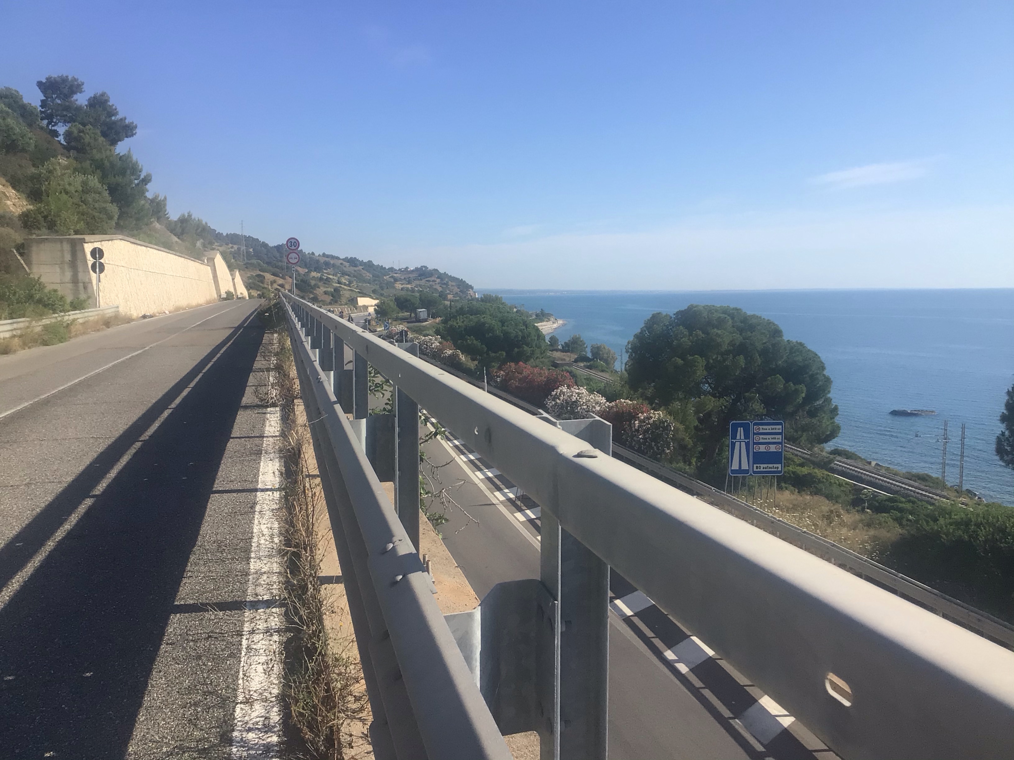 Et puis surprise sur prise. Après avoir passé ce château dans la commune de Marina di Roseto, la route SS106 – E90 se transforme en autoroute … interdite aux vélos bien sûr. Je me retrouve seul à circuler sur une petite route qui longe l’autoroute. Que du bonheur !!!