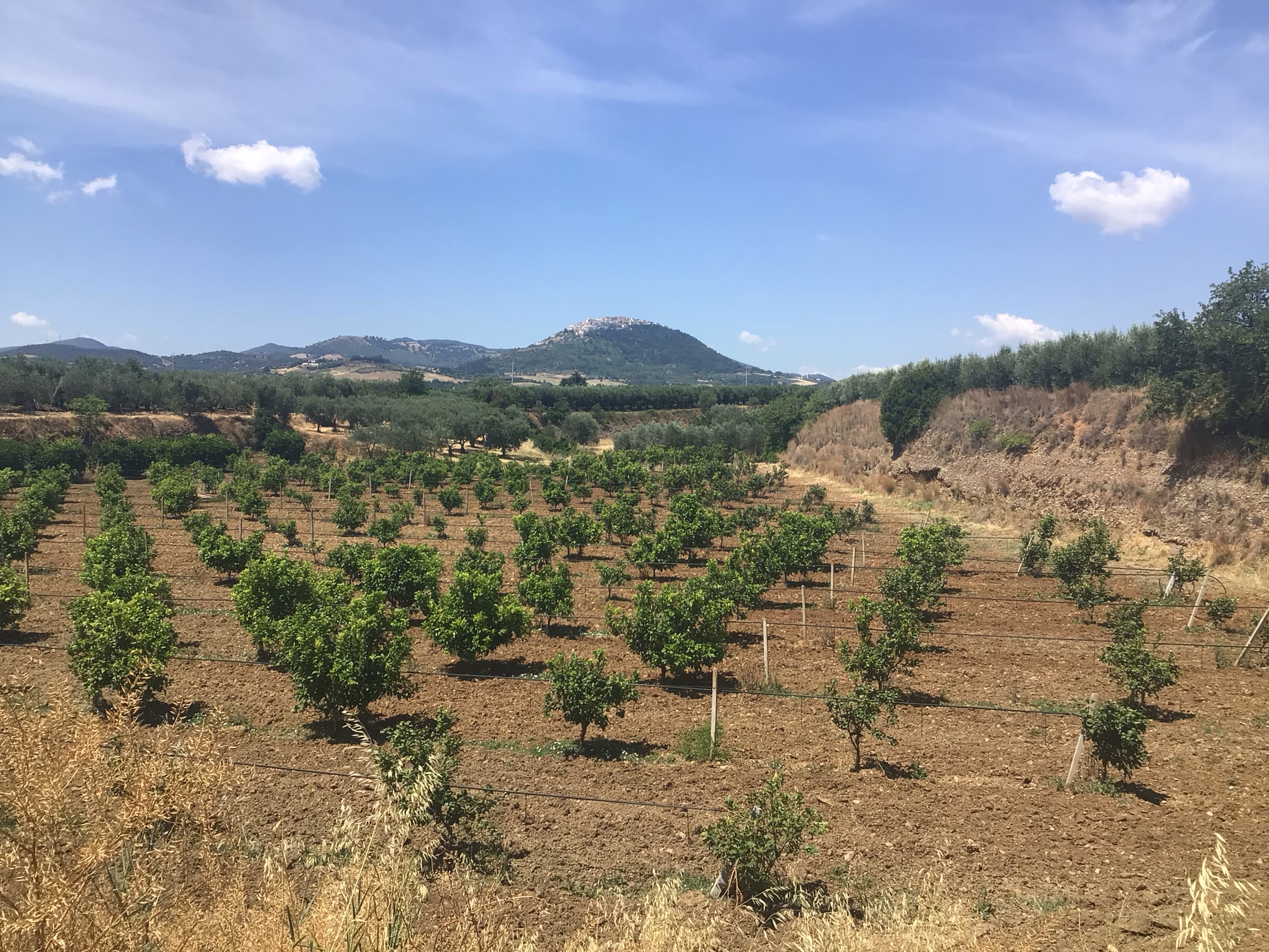 Je ne croise que quelques engins agricoles. De plus, je traverse des zones fruticoles où je peux cueillir des abricots bien juteux ainsi que des oranges. Vers 10h, je m’arrête dans un café de village où les vieux jouent aux cartes. Déjà que les italiens parlent forts mais alors là, c’est le summum ! Par contre, après avoir passé Nova Siri Scalo, je suis dans l’obligation de rentrer dans les terres afin de passer la Fiume Sinni. En suivant la côte, il n’y a pas de pont. En suivant la voie de chemin de fer, c’est impossible. En empruntant la SS106-E90, c’est mortel ! J’emprunte une route qui me fait grimper sur une colline en direction de La Rotondella Due. La Rotondella est un superbe village perché mais à une dizaine de kms de l’autre village et ça a l’air de grimper sec.