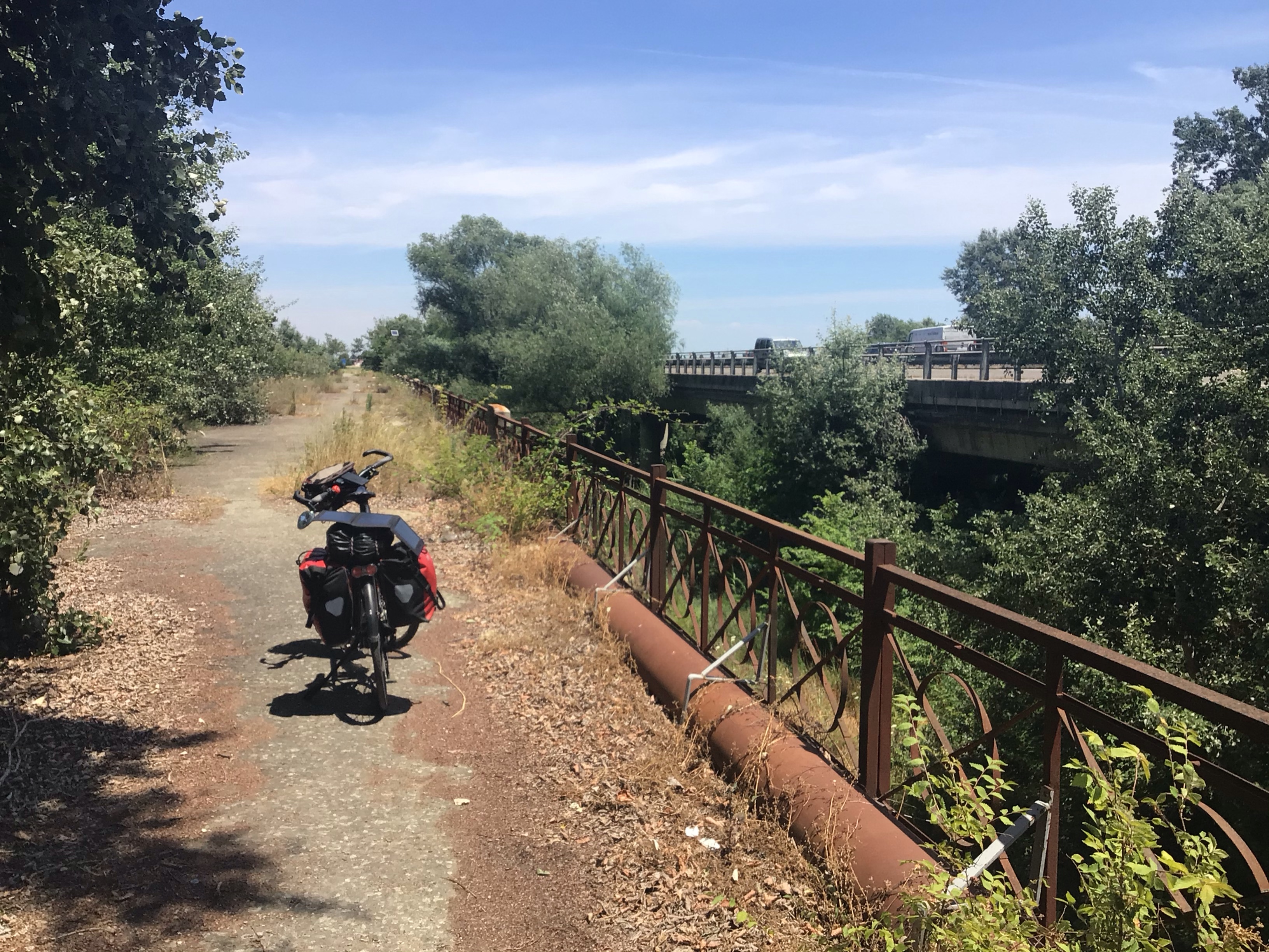 Je profite de traverser ce coin pour faire le plein de brugnons. Les figues ne devraient pas tarder à donner également. Quel régal ! Puis je redescends pour retrouver la route SS106. À Policoro, je sors à nouveau mes lunettes et ma carte pour m’éviter de repartir dans la pampa comme me l’indique mon GPS. Je déniche un chemin qui devrait emprunter un vieux pont pour traverser l’Agri (Vecchio ponte sull’Agri). Bien joué, ça passe sans problème.