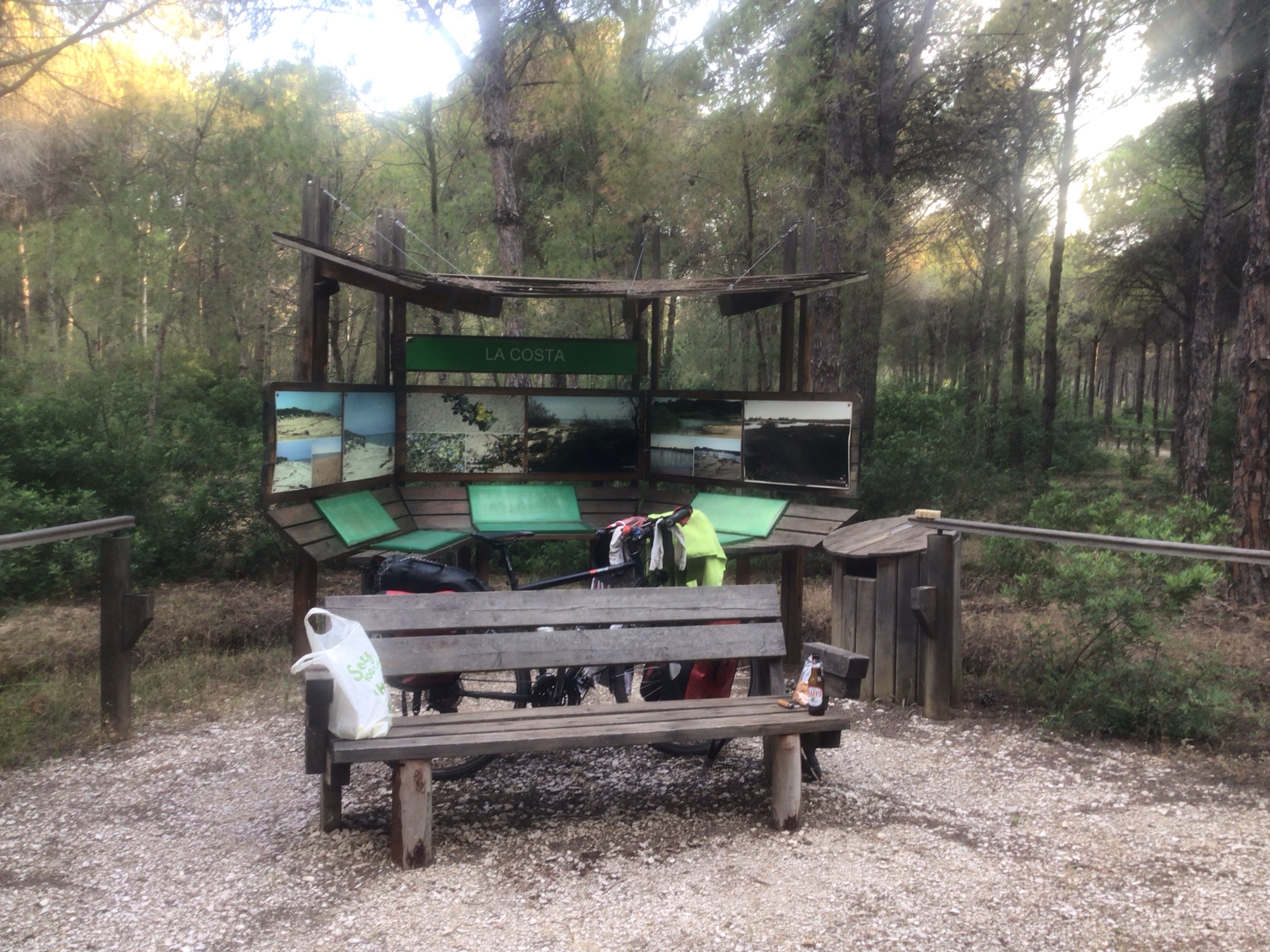 Sur cette route, alors que le soleil tape vraiment fort, mon iPhone pète un câble. Les menus défilent dans tous les sens. Je ne peux même plus l’éteindre ! Je pense qu’il a pris un sérieux coup de soleil sur la tronche. Je le remets au frais dans ma sacoche en espérant que ce n’est pas trop sérieux. De mon côté, je peux me tremper la tête et la casquette dès que je trouve une fontaine. Je vais être fin prêt pour refaire l’Ariégeoise sous la canicule comme l’an dernier. Finalement, j’arrive à redescendre jusqu’à Megapunto où je m’arrête faire des courses. Puis je trouve un parc avant d’arriver sur la côte et ses lidos. J’inspecte les lieux. Parfait pour cette soirée.