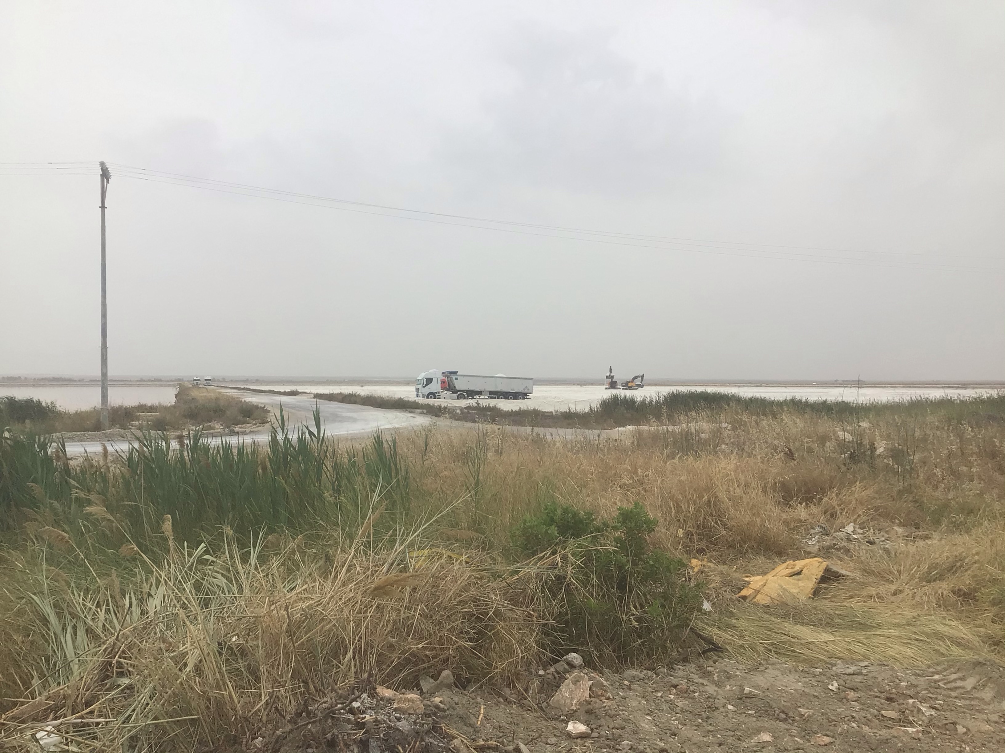 Puis je sors de ce café, remonte sur mon vélo et emprunte ces rues aux pavés noirs désunis. Ça vibre et ma sacoche avant gauche se fait à nouveau la malle maintenu par un seul serre-clips. Heureusement que je l’ai maintenue avec deux ! Je rafistole comme je peux et repars sous une chaleur suffocante. Je traverse des zones agricoles complètement cramées. Arrivé à Fiumara, je prends au plus près de la côte la route SP159. C’est une immense ligne droite avec, à gauche des marais salants et à droite une zone maraîchère où tout est à vendre (terrain, ferme, maison, …) puis, derrière une « diguette », la mer.