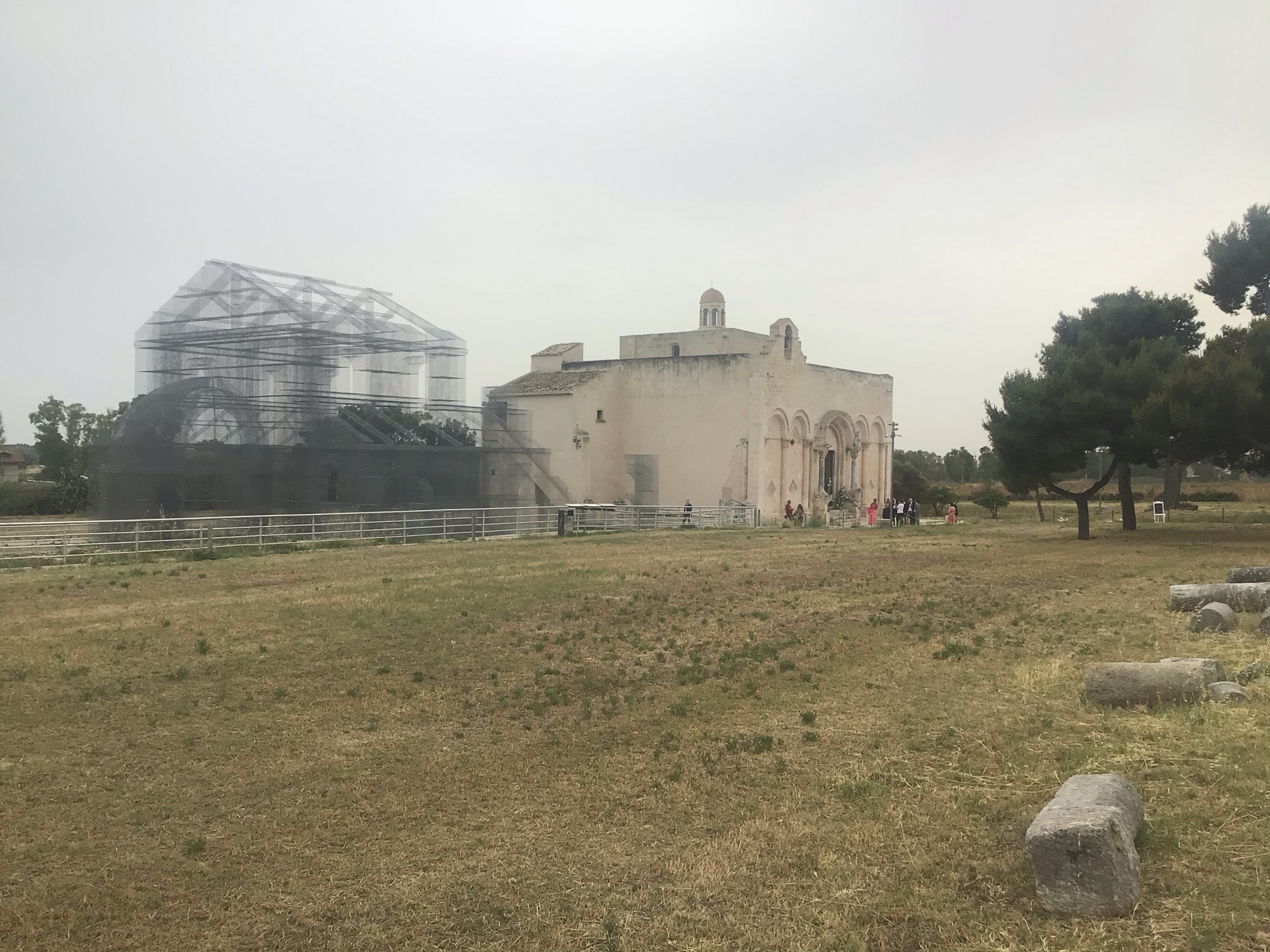 Au loin, à travers la brume de chaleur, on aperçoit la péninsule de Gargano où je me rends. Après m’être douché sommairement avec mon éponge, je reprends ma route jusqu’à Manfredonia. A l’entrée de cette grande cité portuaire, je visite la basilique de Siponto. Et devinez ce qui se passe à l’intérieur ? Et oui : un mariage !