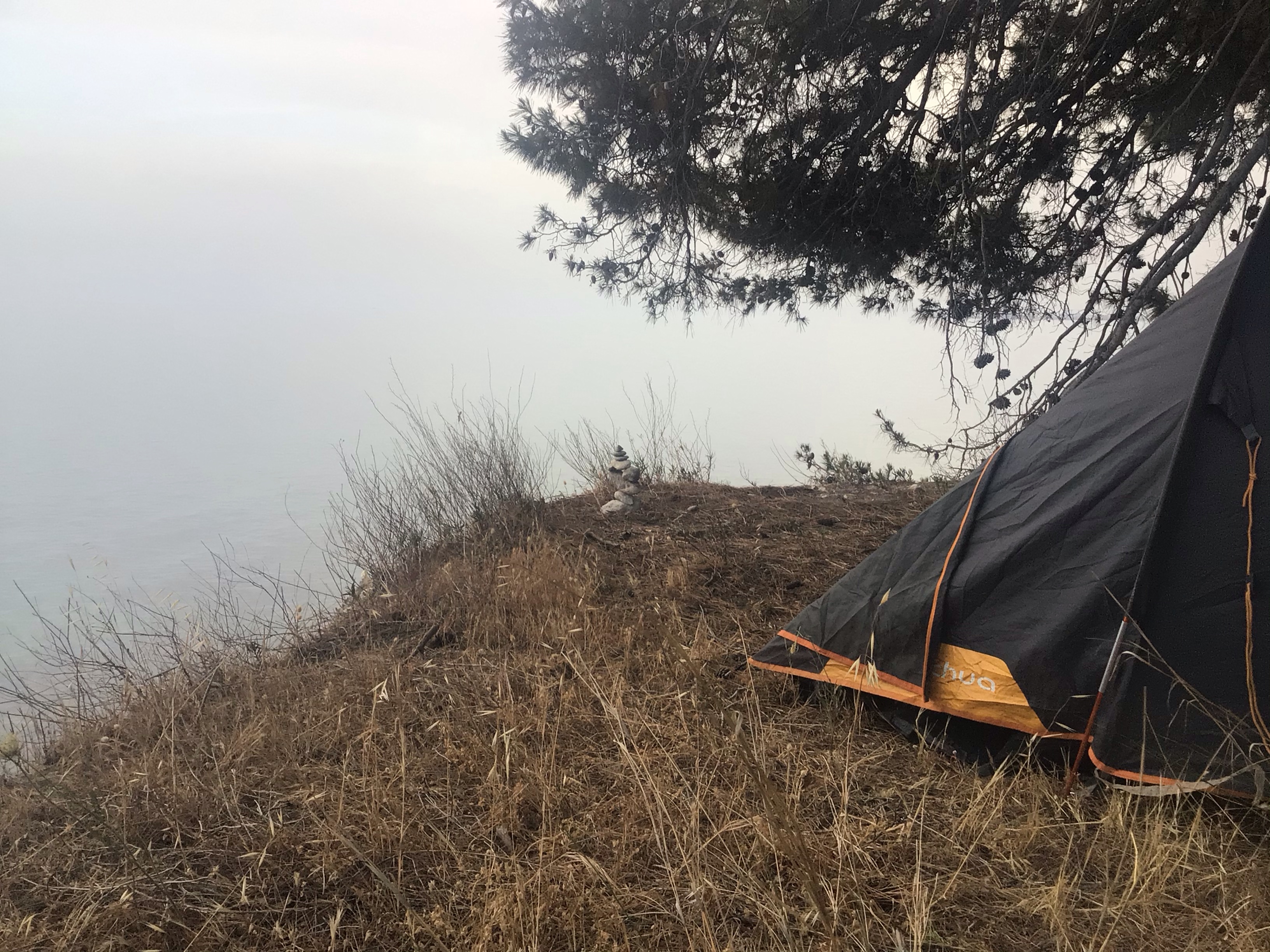 C’est pas le tout mais l’heure passe et il me faut à nouveau penser à trouver un bivouac. Je quitte donc cette grande ville et repère des chemins en partant vers l’Est qui devraient me permettre de trouver mon bonheur. Après quelques kilomètres sur ces fameux chemins, j’accède effectivement en bord de falaise après avoir traversé une oliveraie. C’est Royal de Luxe ! Je dîne presque les pieds dans le vide sur un aplomb d’une trentaine de mètres avec les cigales qui chantent dans les pins méditerranéens. Je dédie d’ailleurs ce bivouac à mon frangin Manu et à Carmina. En regardant le centre de la photo, je pense qu’ils comprendront !