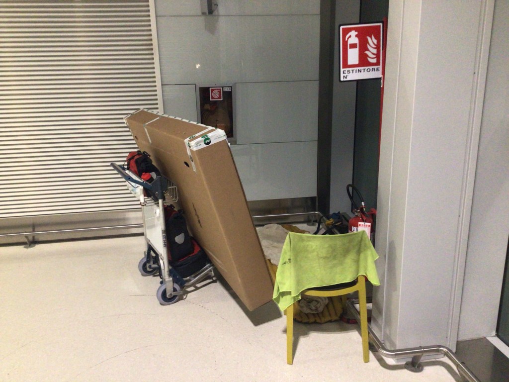 Après avoir passé la fin d’après-midi et la soirée dans l’aéroport de Venise avec cette atmosphère si particulière quand le brouhaha des voyageurs échangeant dans toutes les langues, les annonces répétitives au sujet du Covid-19 en italien puis en anglais et les va-et-vient incessants de la journée font place au calme absolu, je prépare mon dernier « bivouac » de ce périple dans un coin tranquille, mon immense carton me servant de cloison.