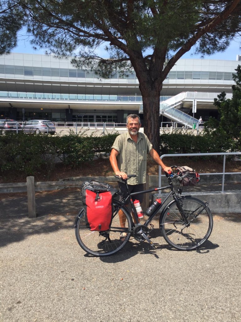 Après une nuit passée sous les néons restés allumés, je suis à nouveau réveillé aux aurores, non pas par le lever du soleil et le gazouillis des oiseaux, mais par les discussions des premiers voyageurs faisant la queue devant le bar-restau à côté de mon campement. Je plie une dernière fois mes affaires, fais une toilette de chat et déjeune à ce restau-bar. Puis j’attends l’ouverture de mon comptoir d’enregistrement. Bien m’en a pris d’être arrivé le premier. En effet, vu la dimension de mon carton, l’embarquement s’avère quelque peu compliqué. Je dois d’abord patienter un long moment avant d’avoir confirmation de bien pouvoir embarqué. Puis aller à un autre comptoir, toujours en me baladant avec mon incombrant chargement, acheter un billet (110€ quand même ce qui ramène le prix du billet à un tarif plus « normal » !), revenir et refaire la queue à l’embarquement pour faire enregistrer mes 2 sacoches, prendre l’ascenseur pour descendre au sous-sol, passer le carton dans le sas des objets XXL (bonjour la manutention !), ouvrir le carton pour vérifier la non-dangerosité du vélo, remonter au contrôle et embarquer, enfin, le dernier dans l’avion !