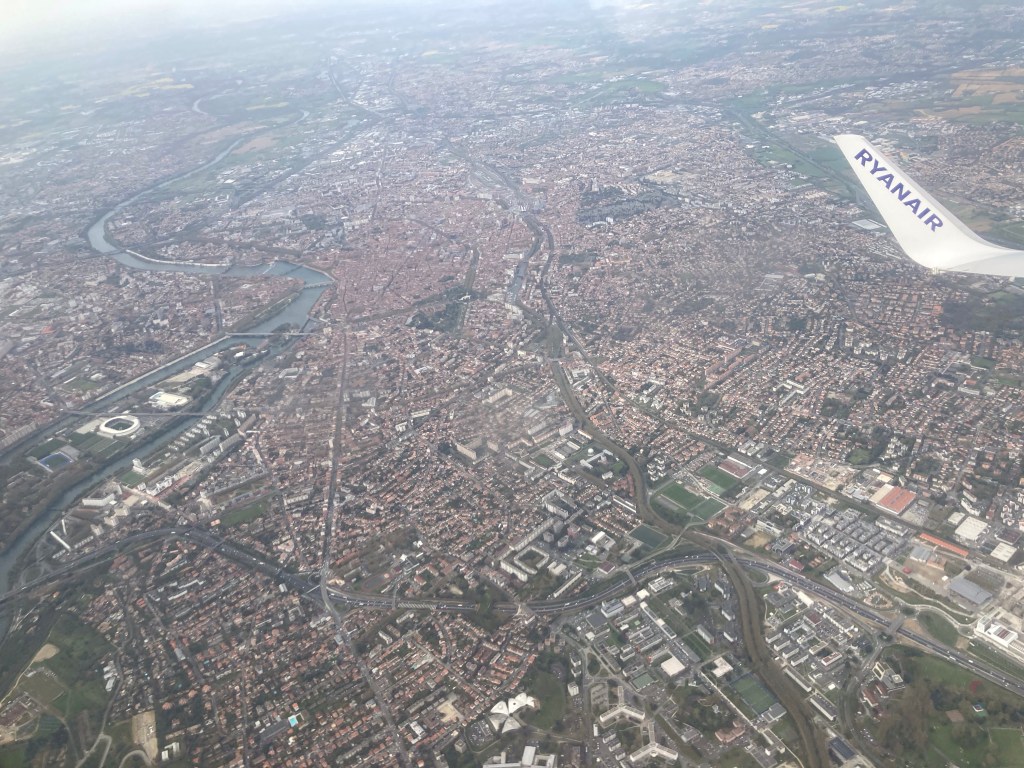 Arrivé vers 10h à l’aéroport de Toulouse-Blagnac après que mon pote Nico du Montcalm m’a déposé avec vélo sous carton et bagages. Il est maintenant 16h. Je suis à bord du vol Ryanair 8888 à destination de Venise. « Et ton bilan carbone ? » pourriez-vous me lancer après ma précédente diatribe. J’ai longtemps hésité à prendre le train mais cela s’avérait vraiment trop long et fastidieux. Quoique. L’avion aurait dû partir à 12h30 heure locale. Mais pour des raisons obscures de « slot » au-dessus de Milan (j’apprendrais plus tard qu’un avion de tourisme s’est écrasé dimanche à côté de l’aéroport de Milan ce qui a dû fortement perturber le trafic aérien) nous sommes immobilisés au sol. Le ciel est bleu. Le vent d’Autan est de retour. Les passagers (s’im)patientent.