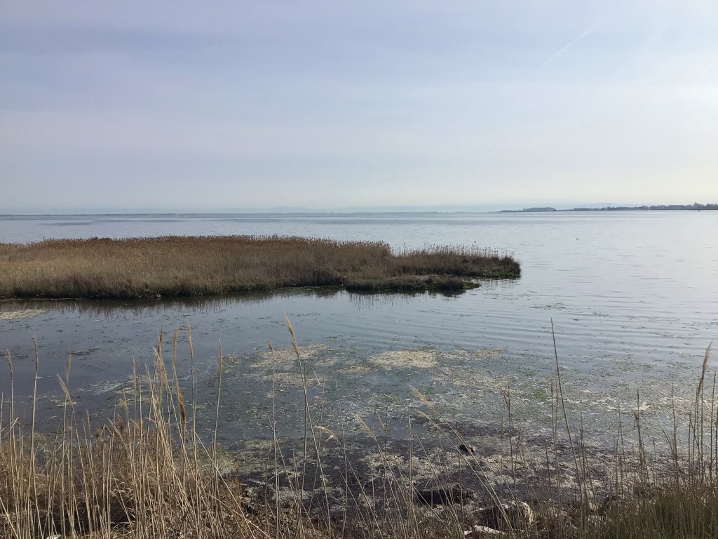 Ma première nuit sous la tente a été bien fraîche. Le froid m’a réveillé en pleine nuit, vu que je dors toujours à loilpé, malgré mon duvet 0°c. Trop la flegme de me rhabiller et de sortir uriner. Je me suis recroquevillé tel un fœtus dans le ventre sa maman en attendant le lever du jour. La routine des préparatifs matinaux est également revenue rapidement. Et vers 8h30, je reprenais la route pour contourner cette immense lagune après avoir essayé de trouver le ferry pour la traverser. Las, il n’est pas encore en service. Cela me rappelle des souvenirs de l’an dernier. Au loin à l’est, j’aperçois Trieste et la côte slovène, prochaine destination.