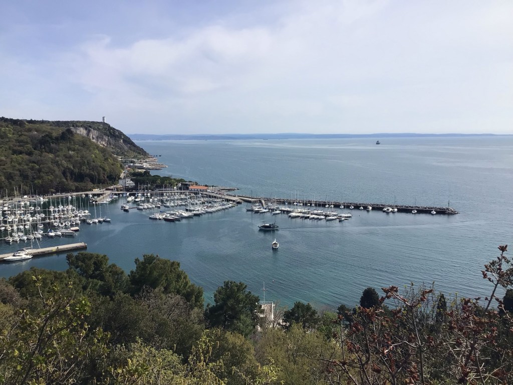 Ce n’est pas le tout mais l’heure avance et il me faut sortir de cette grande ville portuaire si je veux trouver un bivouac. Je reprends donc la route de la côte en direction de la Slovénie où j’ai repéré une forêt avec des chemins de promenade. Arrivé sur place, j’emprunte ce chemin et finis par trouver mon bonheur le long d’une propriété immense avec vue splendide sur la mer. Alors que je m’avance pour trouver un emplacement avec vue sur mer mais pas trop près de la propriété, une biche, en train de paître à découvert des bosquets, me regarde arriver, toute étonnée. Échange de regards. Elle repart à l’abri des regards indiscrets. C’est un signe. Je m’arrête. Fin de la journée.